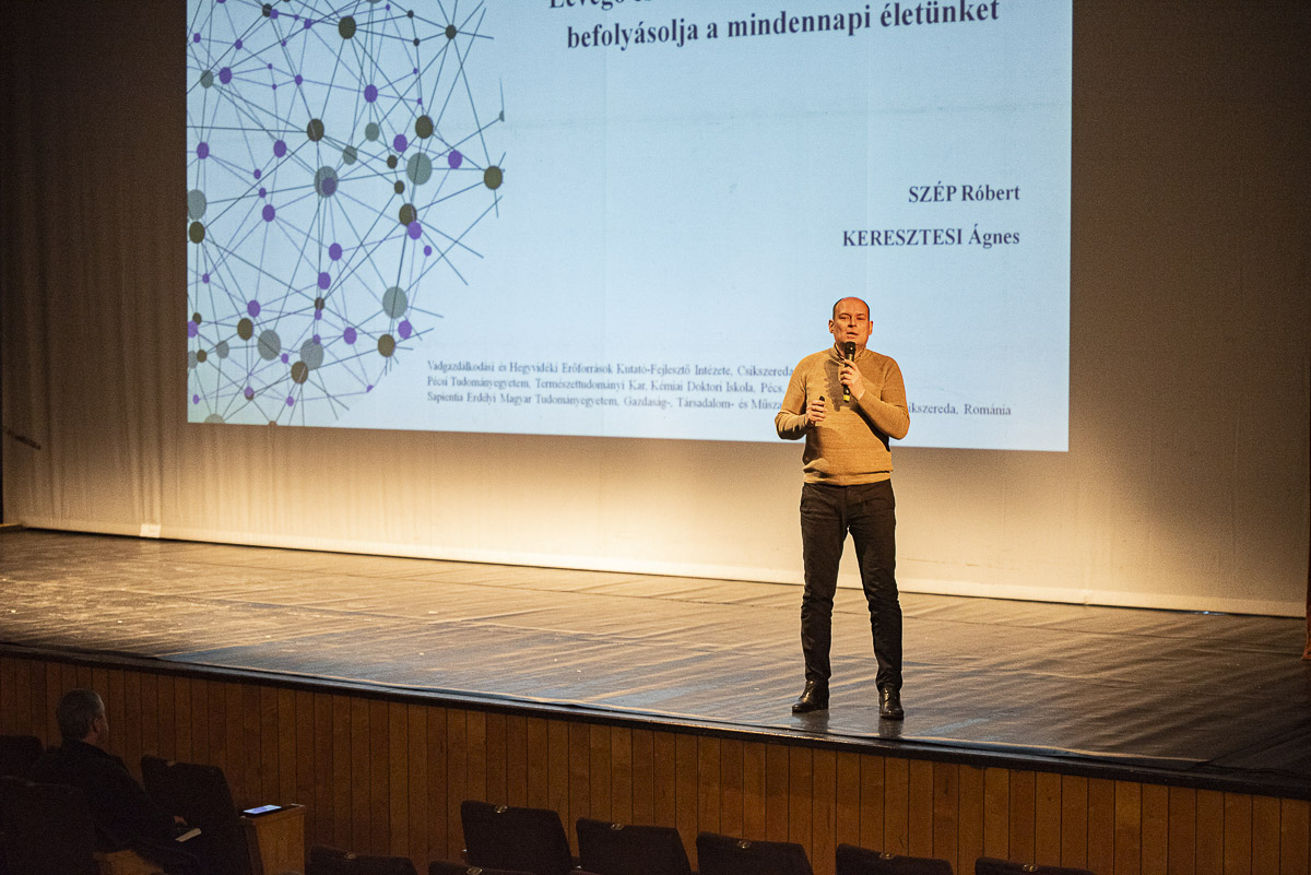Az első előadást kedden dr. Szép Róbert, a csíkszeredai Vadászati és Hegyvidéki Erőforrások Kutató és Fejlesztő Intézetének (ICDCRM) igazgatója tartotta Levegő és víz a Csíki-medencében – ami befolyásolja a mindennapi életünket címmel. A Csíki-medence környezeti folyamataiba nyújtott betekintést, különös figyelmet fordítva a levegőminőség és a vízháztartás közötti összefüggésekre. A szakember közérthetően ismertette, miként hatnak ezek a változások a mindennapi életre, valamint milyen kockázatokkal és lehetőségekkel kell számolni a térségben.