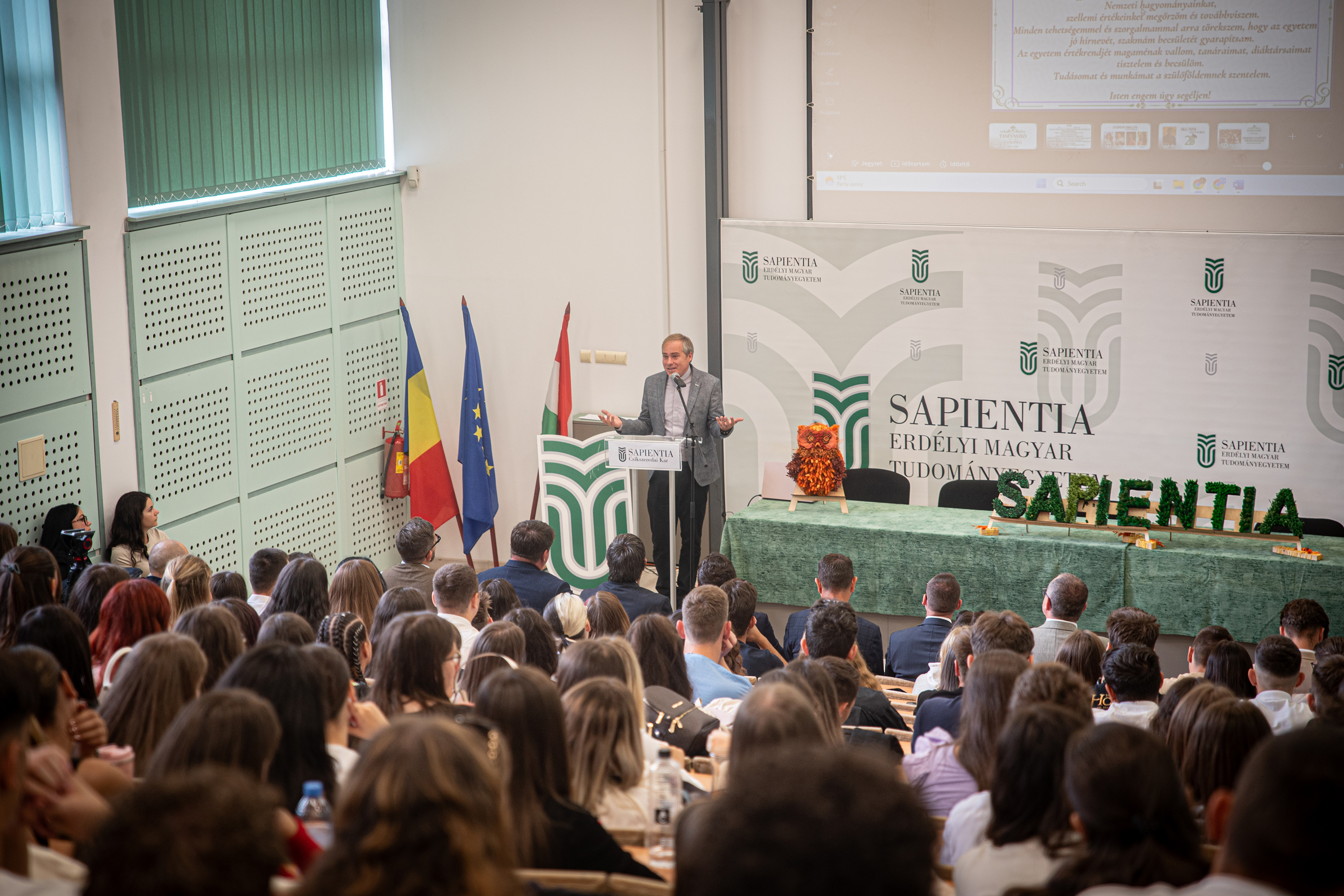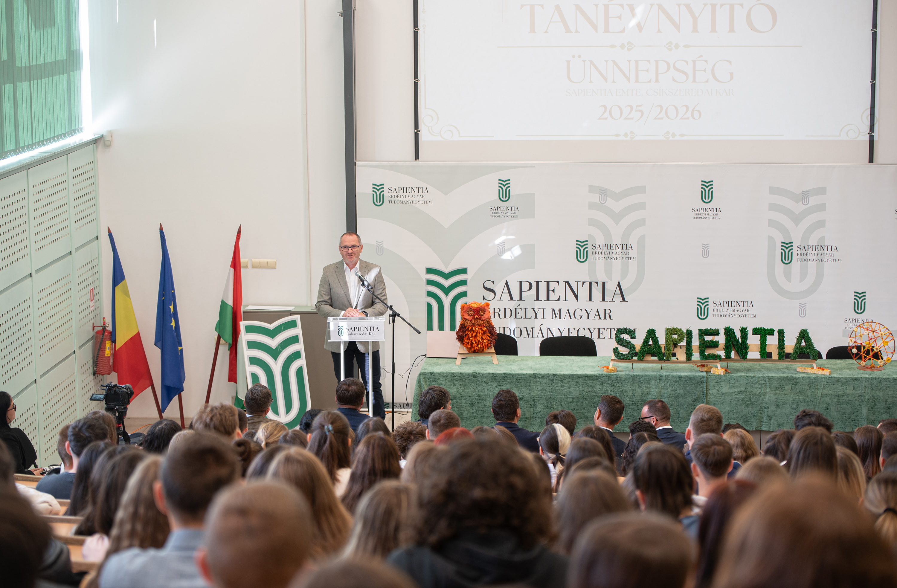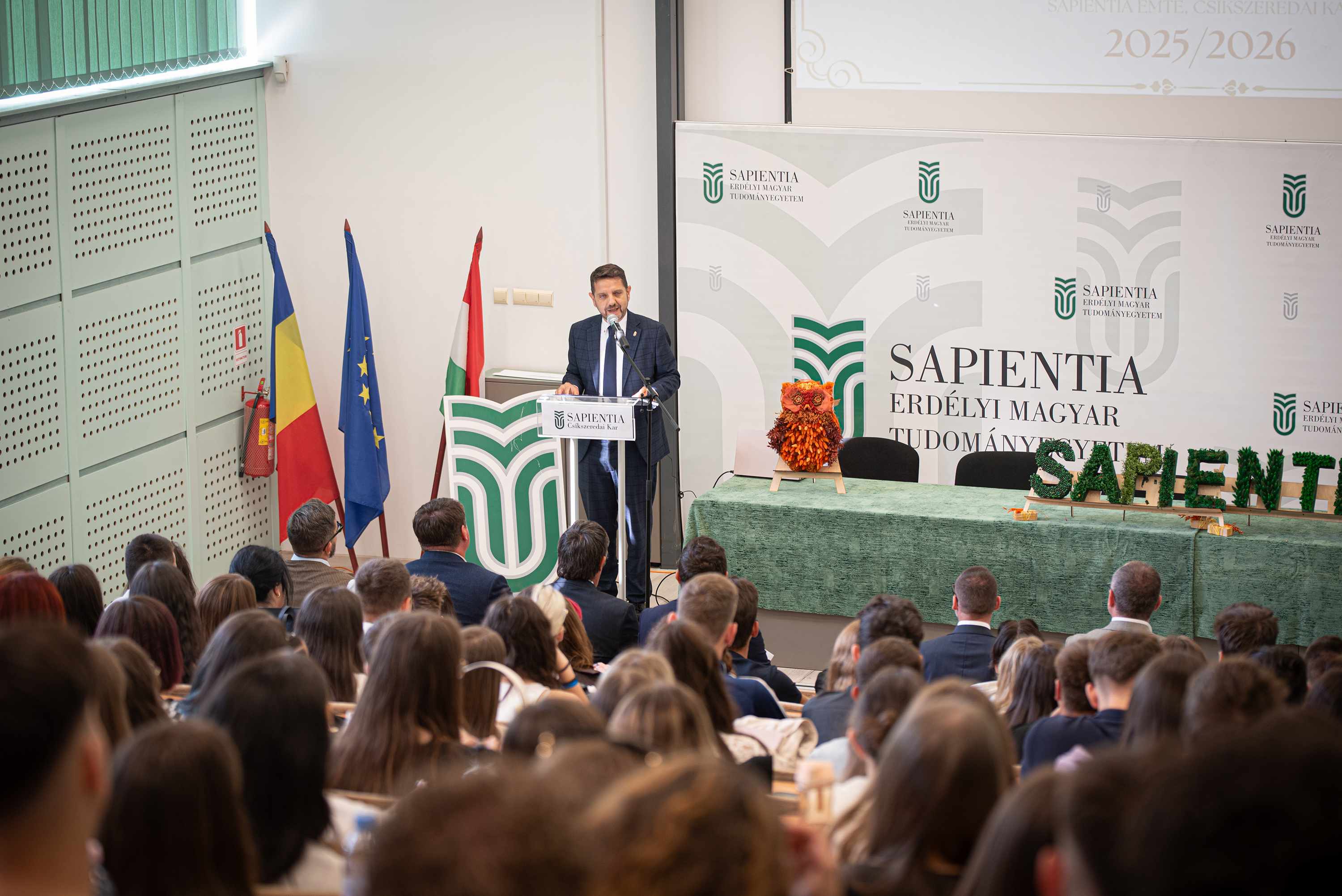 – Legyünk hálásak az elmúlt negyedszázadért, becsüljük meg az alapítók, az oktatók, a munkatársak és az előző hallgatók, generációk munkáját. Ez az örökség a mi felelősségünk. A jövőnk tele van lehetőséggel. Rajtunk is múlik, hogy mit hozunk ki belőle. Vigyük tovább a Sapientia szellemiségét, amely a tudás, a hit és a közösség erejére épül – mondta az elsőéves hallgatóknak a dékán.