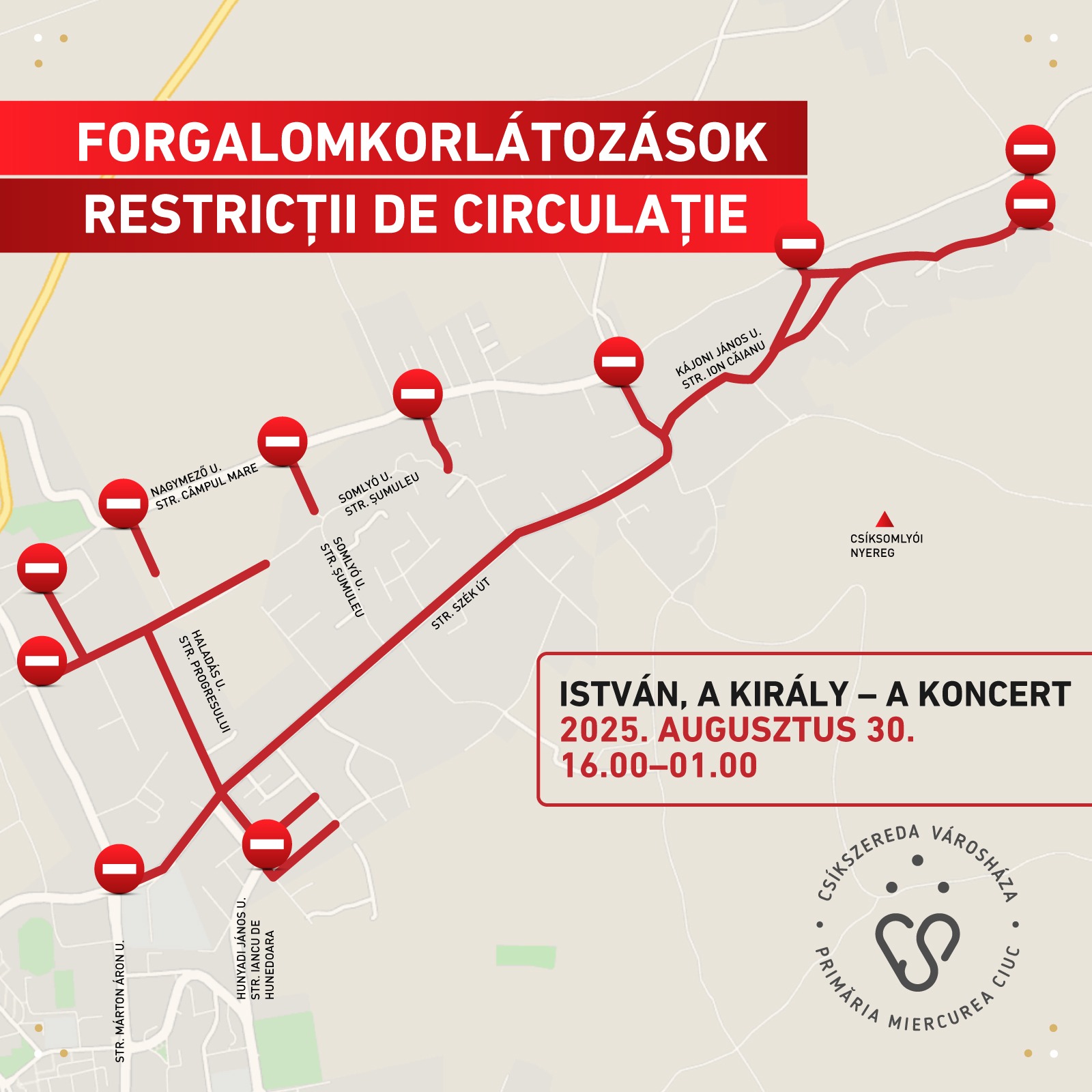 – Célunk, hogy a rendezvény a lehető legbiztonságosabb körülmények között valósuljon meg, főként a gyalogosok védelmében – mondta Bors Béla, Csíkszereda alpolgármestere. Megjegyezte: a forgalomkorlátozás idején csak a Csíki Trans járatai, illetve a közszolgáltatók, rendvédelmi és mentőegységek közlekedhetnek.