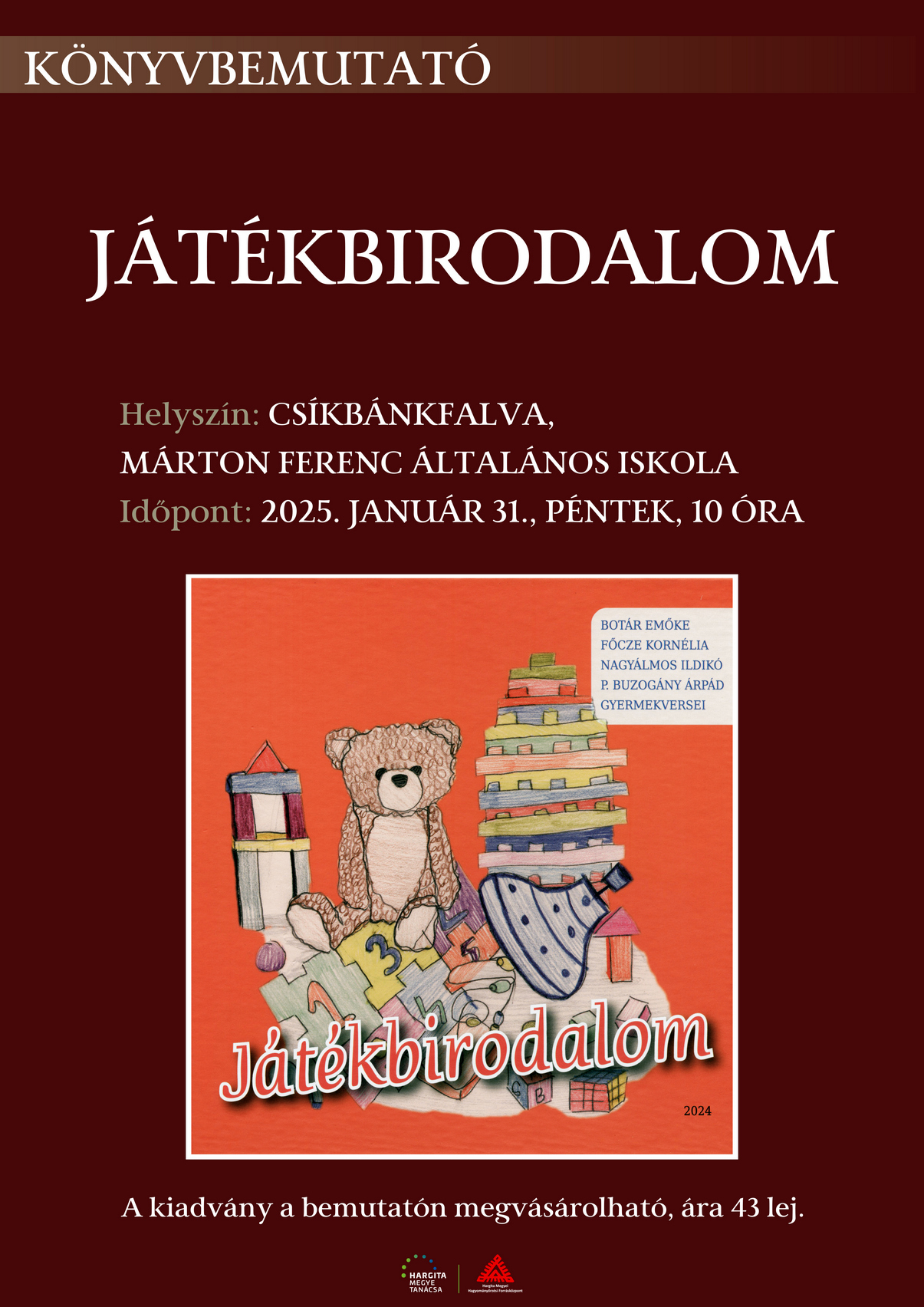 A Játékbirodalom című kortárs gyermekverskötetet mutatják be pénteken 10 órától a csíkbánkfalvi Márton Ferenc Általános Iskolában. A kiadvány Hargita megyei szerzők – Botár Emőke, Főcze Kornélia, Nagyálmos Ildikó és P. Buzogány Árpád – gyermekverseit tartalmazza, a Hargita Megyei Hagyományőrzési Forrásközpont jelentette meg és a székelyudvarhelyi Dr. Palló Imre Művészeti Szakközépiskola tanulói illusztrálták. A Játékbirodalom megvásárolható lesz a helyszínen.