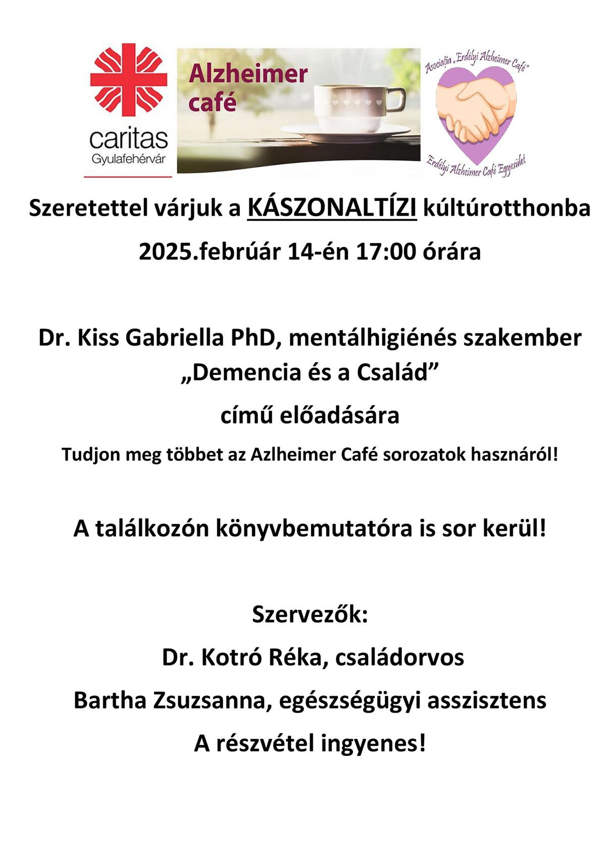 Pénteken 17 órától a kászonaltízi kultúrotthonban tart előadást dr. Kiss Gabriella PhD Demencia és a család címmel. Az Alzheimer Café keretében könyvbemutatót is szerveznek. Részvétel ingyenes.