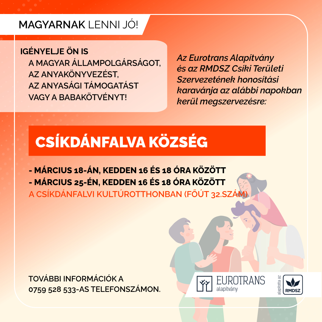 Az RMDSZ Csíki Területi Szervezete az Eurotrans Alapítvánnyal együttműködve kiszállást szervez Csíkdánfalva és Karcfalva községbe. Az érdeklődők szerdán 16 és 18 óra között a csíkdánfalvi kultúrotthonban (Fő út 32. szám), valamint a karcfalvi kultúrotthonban adhatják le a különböző eljárásokhoz szükséges irataikat. A dossziék összeállítása minden esetben díjmentes. Érdeklődni az RMDSZ Csíki Területi Szervezetének székházában (Csíkszereda, Mihai Eminescu utca 2/A szám) vagy a Magyar Ügyek Házában, hétköznapokon 8 és 16 óra között, valamint a 0759–528533-as telefonszámon lehet.