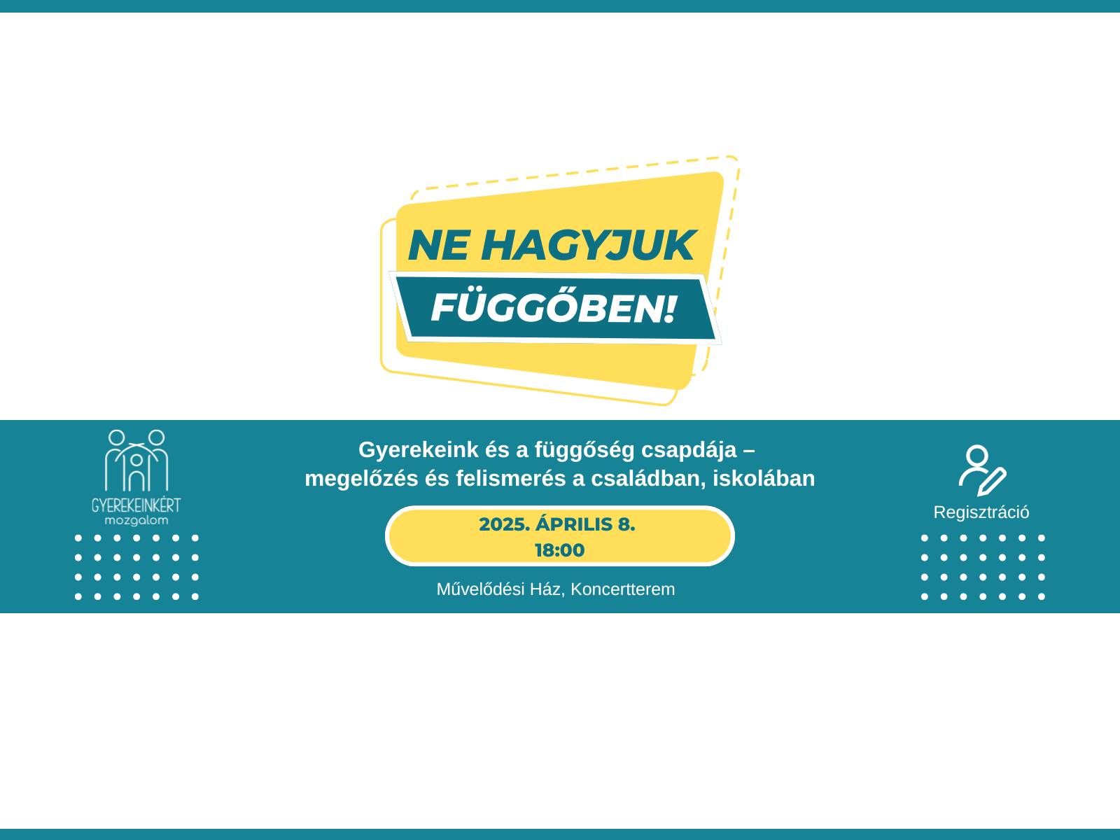 Ne hagyjuk függőben! Gyerekeink és a függőség csapdája – megelőzés és felismerés a családban, iskolában címmel szerveznek előadást a székelyudvarhelyi Művelődési Ház koncerttermében kedden 18 órától. Az eseményen szakértőkkel járják körbe a függőségek pszichológiáját, kialakulásukat és leküzdésük lehetséges útjait óvodáskortól felnőttkorig. A meghívottak között pszichiáter, családorvos, iskolai tanácsadó és rendőr is lesz, akikkel a házigazda, Varga Andrea iskolapszichológus beszélget. A részvétel ingyenes, de regisztrációhoz kötött, regisztrálni az esemény közösségi oldalán található űrlap kitöltésével lehet.