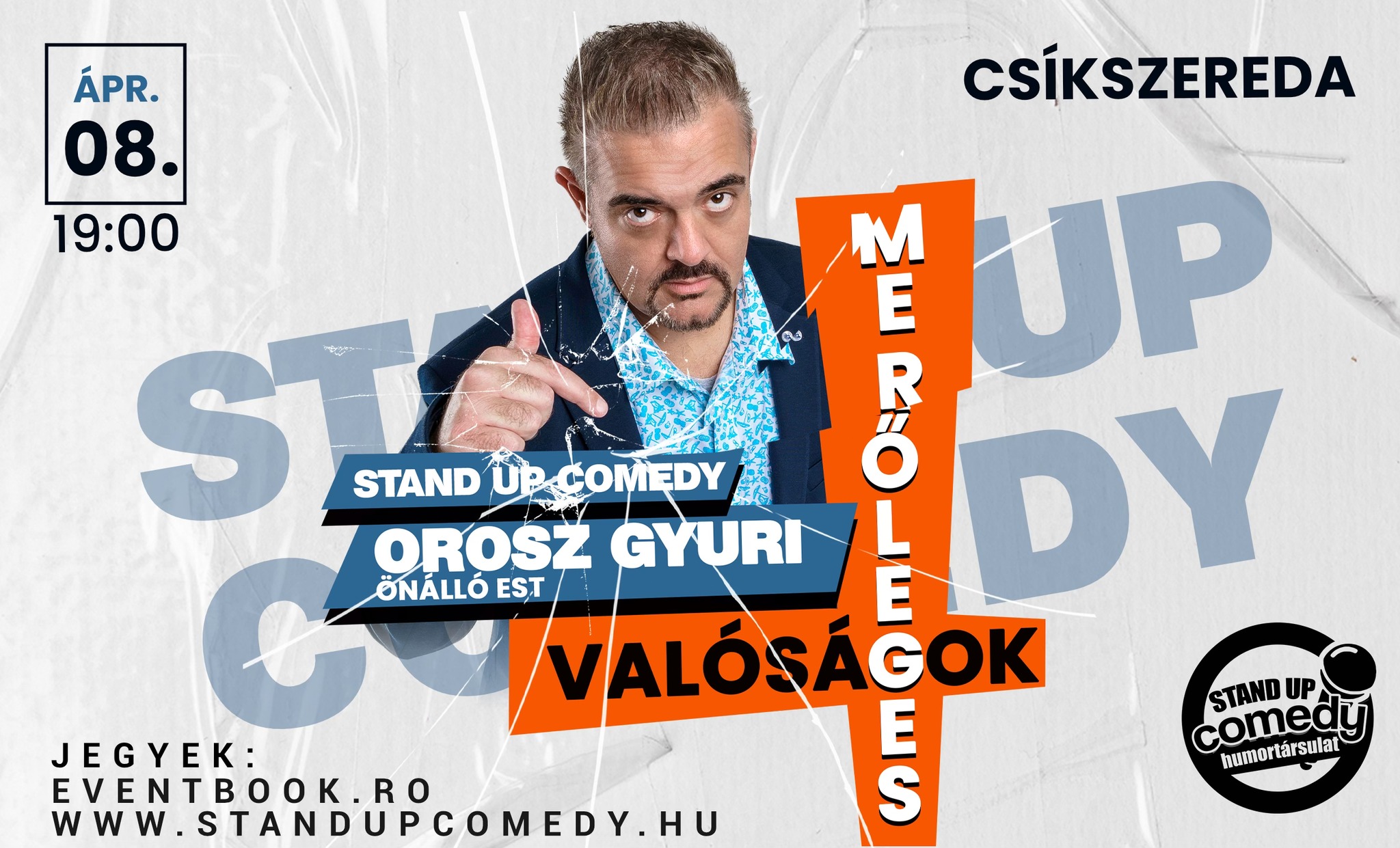 Csíkszeredába is elviszi Merőleges valóságok című önálló stand up comedy estjét Orosz Gyuri humorista. A humorest a Művészetek Házában tekinthető meg kedden 19 órától. „Az est egy őszinte sziget a hazugságok tengerében. Az előadáson szembesülhetünk a saját igazságainkkal, és feloldozást is nyerhetünk, hogy nem csak mi hazudtunk. Ez az előadás nem finomkodik, utána haragot érezhetsz Orosz Gyuri iránt, de pár nap múlva ráeszmélsz, hogy őt szereted a legjobban az összes humorista közül” – áll az esemény meghívójában. A jegyek ára elővételben az eventbook.ro oldalon 65 lej, a helyszínen az előadás napján 75 lej.