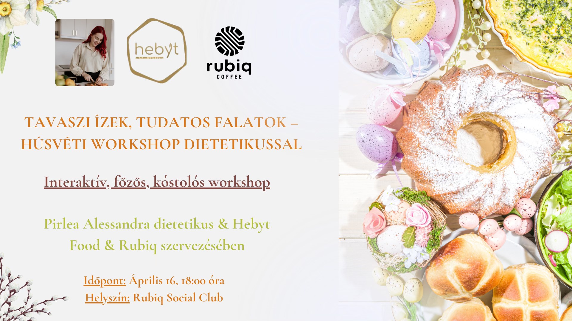 Tavaszi ízek, tudatos falatok címmel szerveznek húsvéti workshopot Pirlea Alessandra dietetikus vezetésével a csíkszeredai Rubiq Coffeeban (Gál Sándor utca 8. szám) szerdán 18 órától. Az eseményen olyan húsvéti klasszikusokat készítenek el közösen, cukor nélkül, IR-barát módon, mint a répatorta kuglóf, medvehagymás pogácsa vagy tonhalkrémmel töltött céklás tojás. A résztvevők a workshop mellé ajándékba megkapják a „Lágy ízek, könnyed test – Húsvét tudatosan” e-bookot, a részvételi díj 150 lej (ami tartalmaz egy maximum 60 lejes italfogyasztást, az előadást és a finomságok készítését, kóstolását). Jelentkezni a 0771–647239-es telefonszámon lehet.