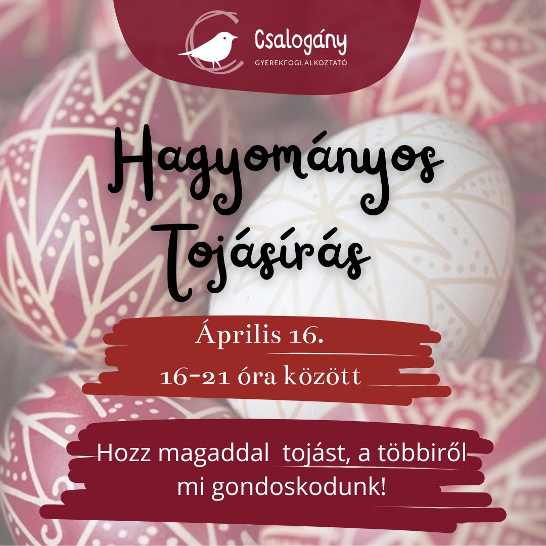 Hagyományos húsvéti tojásírást szerveznek Csíkszeredában a Csalogány Gyerekfoglalkoztatóban (Tudor Vladimirescu utca 14. szám, hátsó ajtó) szerdán 16 és 21 óra között. A résztvevőket arra kérik, hogy vigyenek magukkal főtt vagy kifújt tojást, minden más szükséges kelléket ők biztosítanak. A részvételi díj felnőtteknek 30 lej/fő, gyermekeknek 25 lej/fő. Amíg a felnőttek a tojásfestésre összpontosítanak, addig a gyermekek szabadon játszhatnak a játékszobában, vagy ők is kipróbálhatják a tojásírást. A részvétel regisztrációhoz kötött, jelentkezni az esemény közösségi oldalán levő űrlap kitöltésével lehet.