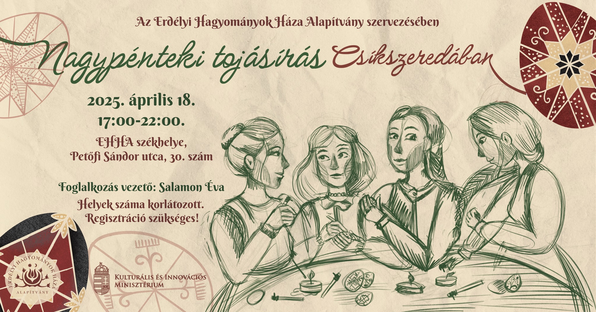 A tojásírás napjainkban is élő hagyomány, a hímes tojás a húsvéti ünnepkör ősi, kultikus szimbóluma, az újjászületés, a feltámadás jelképe. Az Erdélyi Hagyományok Háza Alapítvány nagypénteki tojásírást szervez az alapítvány csíkszeredai székhelyén (Petőfi Sándor utca 30. sz.) pénteken 17 órától Salamon Éva vezetésével. A foglalkozás célja, hogy elsajátítsuk a tojásírás fortélyait, megőrizzük és továbbadjuk ennek hagyományát. A belépő felnőtteknek 30 lej, 18 éven aluliaknak 15 lej, a résztvevőket arra kérik, hogy vigyenek magukkal főtt vagy kifújt tojást, minden más szükséges kelléket a szervezők biztosítanak. A helyek száma korlátozott, jelentkezni az esemény közösségi oldalán levő űrlap kitöltésével lehet.