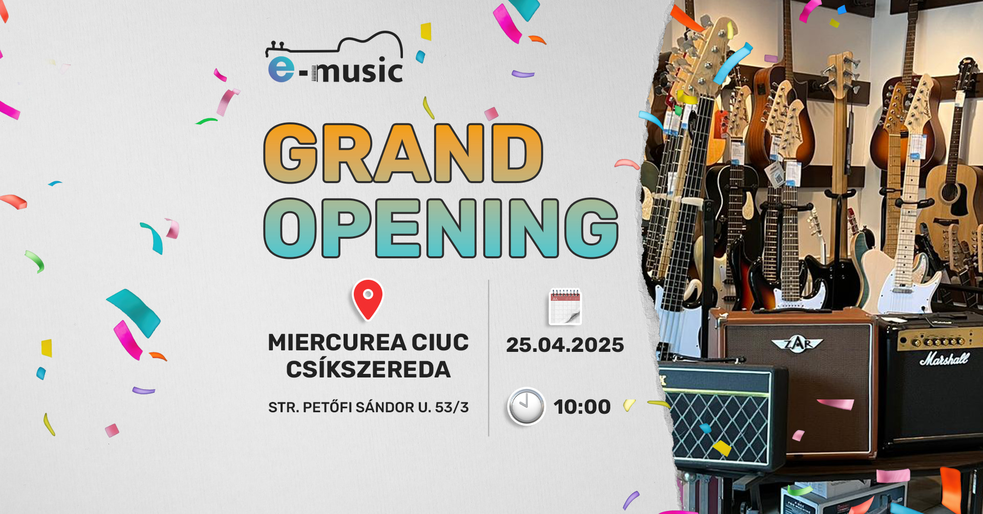 Dobokat, billentyűs és fúvós hangszereket, gitárokat, hangfalakat és rengeteg kiegészítőt kínál az E-music hangszerbolt Csíkszeredában, amely pénteken 10 órától nyitja meg kapuit a vásárlók előtt a Petőfi Sándor utca 53/3. szám alatt. Az üzletbe érdemes már a nyitás napján ellátogatni, ugyanis az érdeklődőket szerencsekerék, kedvezmények és meglepetések várják.