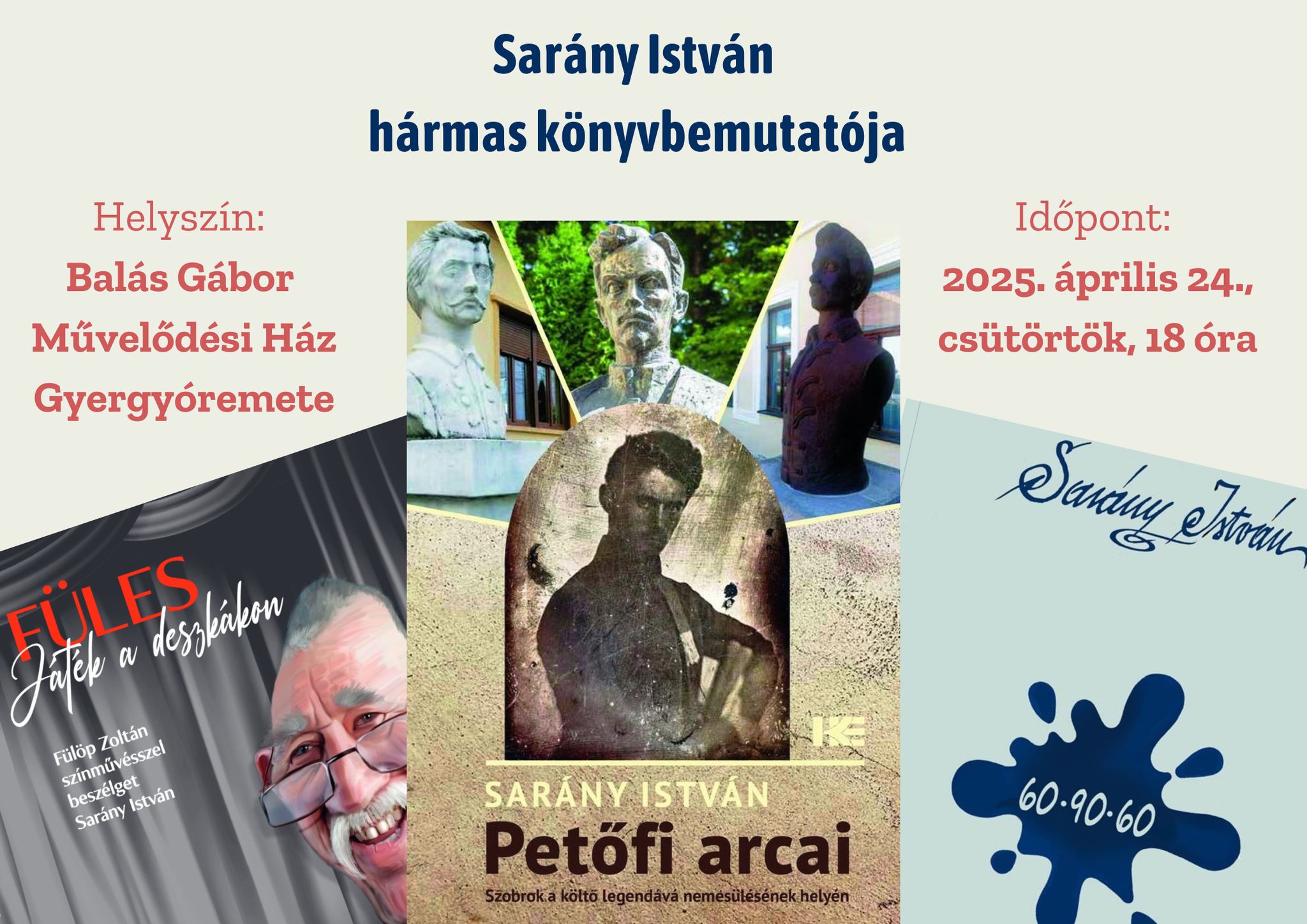 Sarány István Füles. Játék a deszkákon, a Petői arcai és a 60-90-60 című könyvét ismerheti meg a közönség egy hármas könyvbemutatón csütörtökön 18 órától a gyergyóremetei Balás Gábor Művelődési Házban. A kötetek a helyszínen megvásárolhatók, a könyvek ára: 60, 25 és 25 lej.
