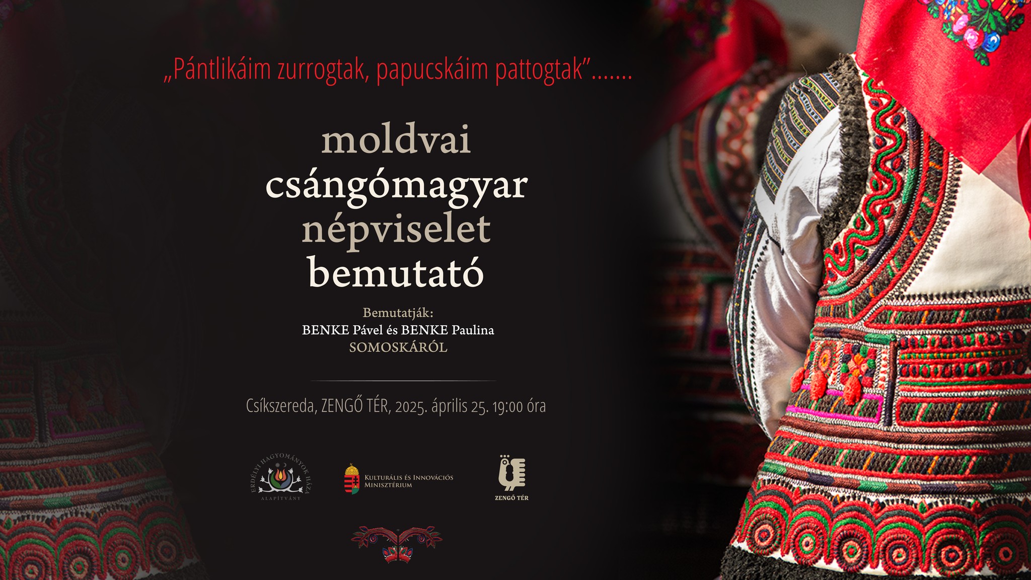 „Pántlikáim zurrogtak, papucskáim pattogtak…” címmel tartanak bemutatót a moldvai csángómagyar népviseletről pénteken 19 órától a csíkszeredai Zengő Térben (Petőfi Sándor utca 35. szám). A viseleteket somoskai vendégek, Benke Pável és Benke Paulina mutatja be, ezt moldvai csángómagyar népzenei koncert és táncház követi. Az esemény szervezője az Erdélyi Hagyományok Háza Alapítvány. Az egész esti programokra a belépő 10 lej.