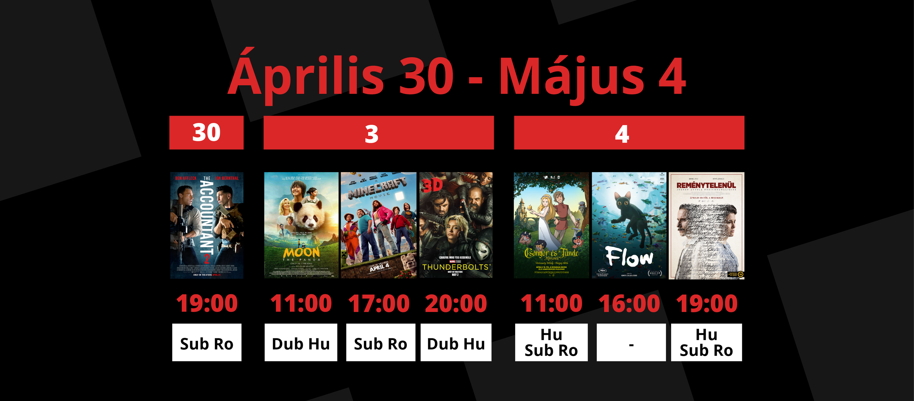 Szerdán 19 órától vetítik a The Accountant 2 (A könyvelő 2) című 2025-ös akcióthrillert angol (eredeti) nyelven, román felirattal. Szombaton 11 órától a Moon, a panda című családi vígjáték lesz látható magyar szinkronnal. 17 órától a 2025-ös élőszereplős svéd–amerikai családi kalandfilmet, A Minecraft Movie-t (Egy Minecraft Film) tűzik műsorra angol (eredeti) nyelven, román felirattal, majd 20 órától a Mennydörgők* (Thunderbolts*) című 2025-ös akciókrimi lesz látható. Vasárnap 11-től a Csongor és Tünde animációs filmet vetítik magyar (eredeti) nyelven, román felirattal, amit 16 órától az Áradás (Flow) című animációs családi kalandfilm követ. A vasárnapi vetítések sorát a Reménytelenül – József Attila pszichoanalízise című magyar romantikus, életrajzi dráma zárja 19 órától. A vetítésekre jegyek válthatók a bilete.ro honlapon.