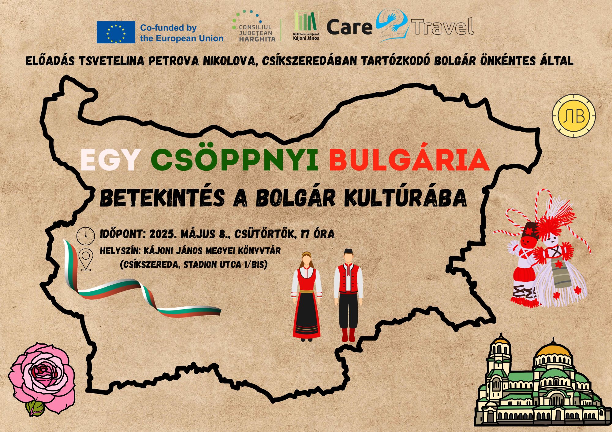 Egy csöppnyi Bulgária: betekintés a bolgár kultúrába címmel szervez interkulturális estet a Care2Travel Egyesület és a Kájoni János Megyei Könyvtár csütörtökön 17 órától a könyvtárban. Az eseményen Tsvetelina Petrova Nikolova, a Csíkszeredában tartózkodó bolgár önkéntes mutatja be a jelenlevőknek Bulgária történelmét, kultúráját, gasztronómiáját, látványosságait, gasztronómiáját, és hogy mely helyszíneket érdemes – szerinte – meglátogatni.