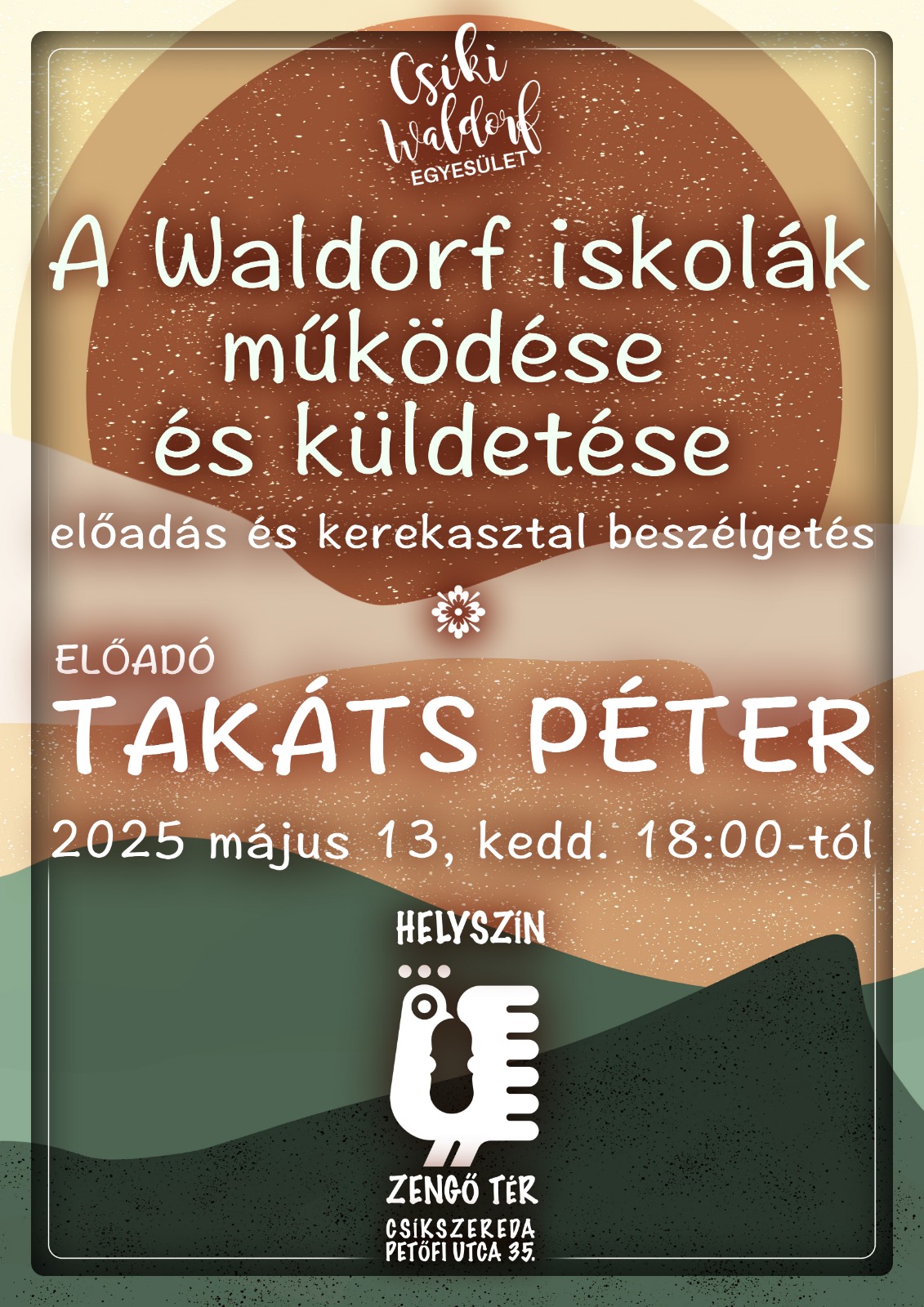 A Waldorf iskolák működése és küldetése címmel szerveznek előadást és kerekasztal-beszélgetést kedden 18 órától a csíkszeredai Zengő Térben (Petőfi Sándor utca 35. szám). Az eseményen jelen lesz Takáts Péter – a Waldorf-pedagógia elismert szakértője, a Waldorf Kalauz című könyv szerzője –, segítségével az érdeklődők betekintést nyerhetnek a Waldorf-pedagógia alapelveibe, céljaiba és gyakorlati megvalósulásába. Az előadás ingyenes.