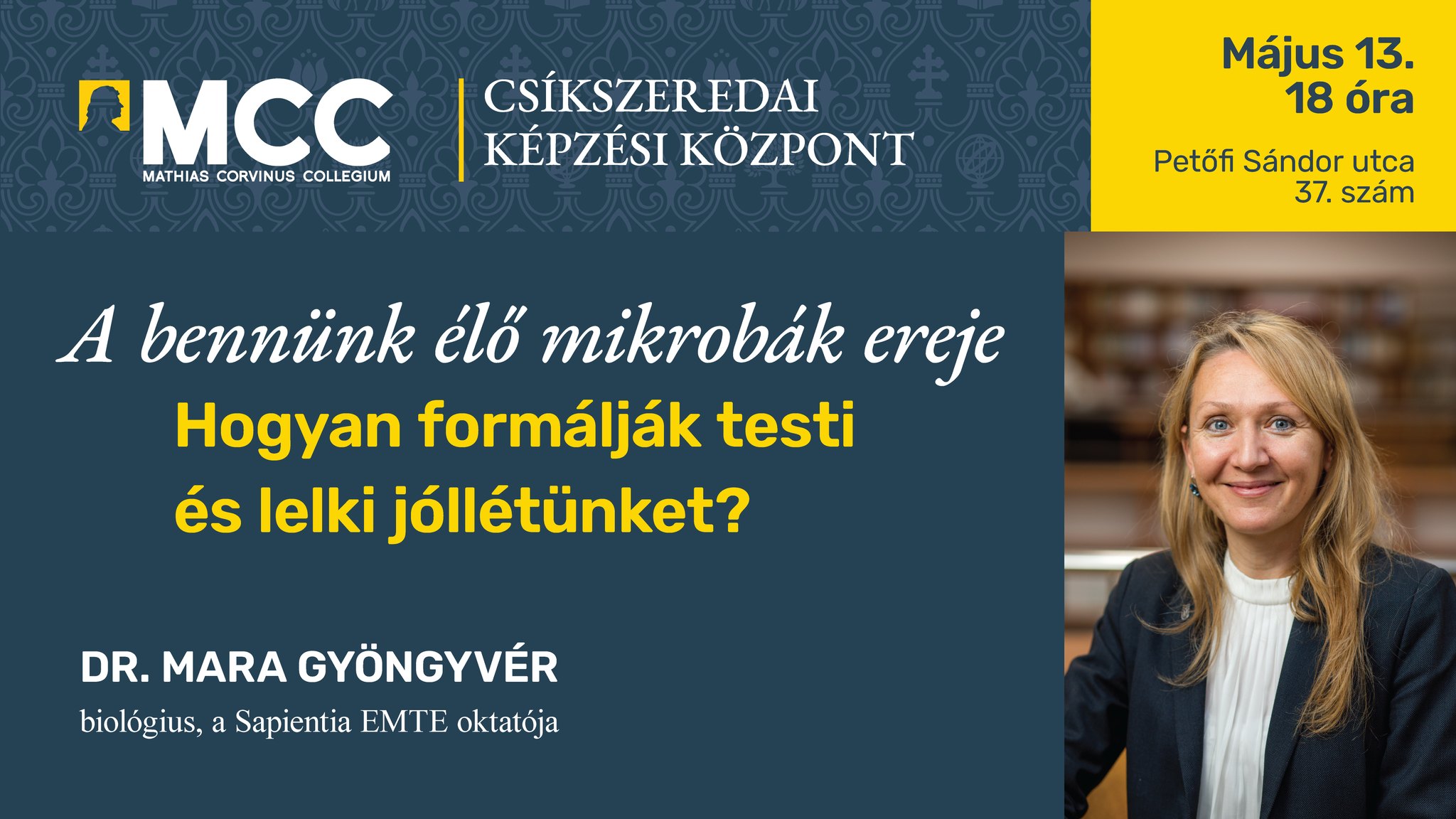 A bennünk élő mikrobák hogyan formálják testi és lelki jóllétünket címmel szervez előadást a Mathias Corvinus Collegium. Az előadást kedden 18 órakor tartják az MCC Csíkszeredai Képzési Központjában, a Petőfi Sándor utca 37. szám alatt. Az előadáson kiderül, hogyan alakul ki a mikrobiomunk, hogyan változik az évek során, milyen hatással van az életünkre, az egészség megőrzésére és a betegségek kialakulására, hogyan befolyásolhatják akár a párválasztásunkat vagy a kedélyállapotunkat, valamint hogy miként lehet fenntartani az egészséges mikrobaközösségünket, és mit tehetünk a mikrobiom egyensúlyának megbomlása esetén. Meghívott előadó dr. Mara Gyöngyvér, a Sapientia – EMTE Csíkszeredai Karának oktatója. Az eseményre regisztrálni az MCC weboldalán található űrlap kitöltésével lehet.