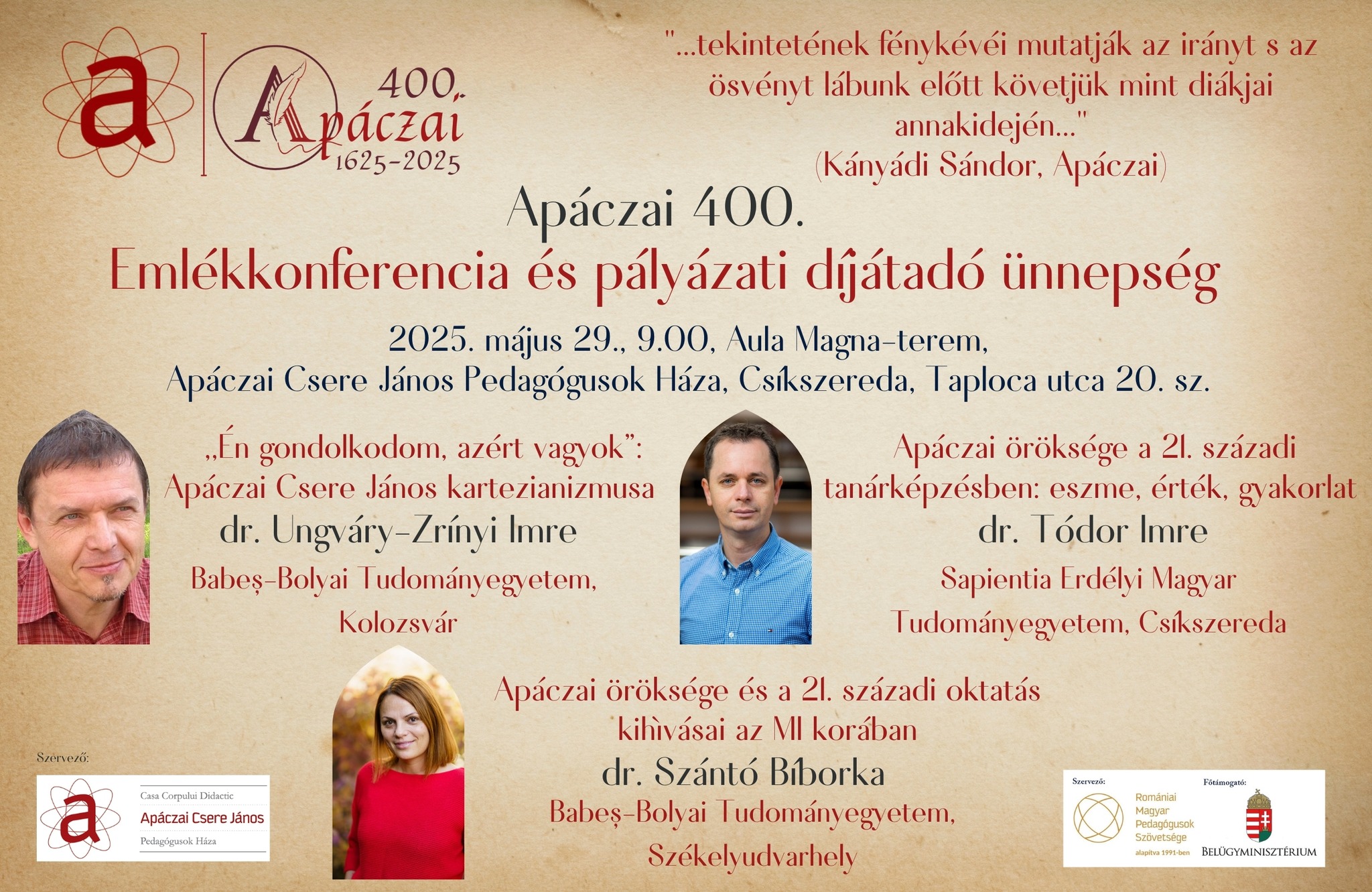 Emlékkonferenciát és pályázati díjátadó ünnepséget szerveznek csütörtökön 9 órától Csíkszeredában, az Apáczai Csere János Pedagógusok Házában (Taploca utca 20. szám). A rendezvényen megemlékeznek a Hargita Megyei Pedagógusok Háza névadójára, Apáczai Csere Jánosra, a magyar pedagógia úttörőjére és klasszikusára, a legnagyobb magyar tanítóra, nevelőre, gondolkodóra. A délutánig tartó eseményen plenáris előadások, zenés műsor, díjátadó, koszorúzás és állófogadás is várja az érdeklődőket. Társszervezők: a csíkszeredai Apáczai Csere János Pedagógusok Háza és a Romániai Magyar Pedagógusok Szövetsége.
