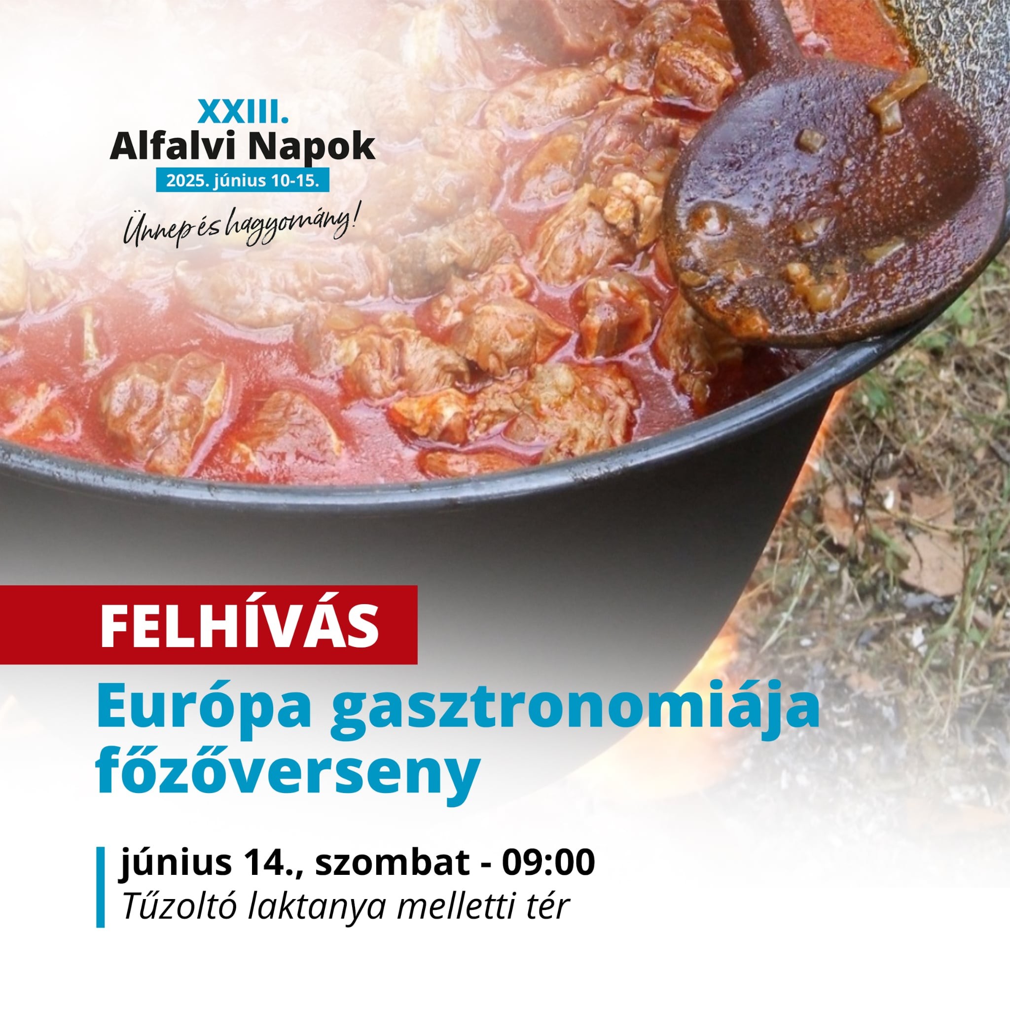 A XXIII. Alfalvi Napok részeként Európa gasztronómiája főzőversenyt szerveznek szombaton 9 órától a tűzoltólaktanya melletti téren. Az eseményre baráti társaságok, családok, összeszokott munkahelyi csapatok jelentkezését várják legkésőbb csütörtökig, ugyanis a helyek száma korlátozott. Jelentkezni a 0741–412221-es számon lehet.