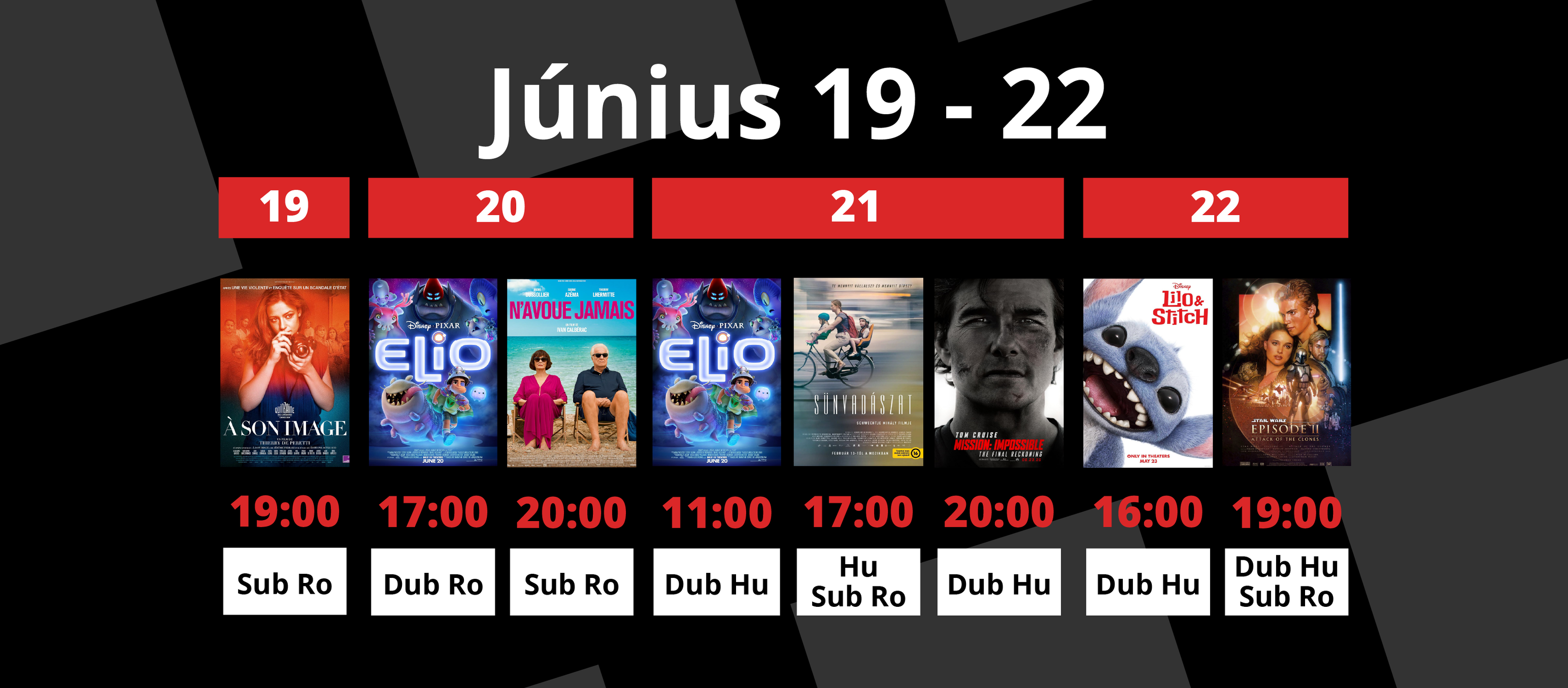 Csütörtökön 19 órától az À son Image című francia drámát vetítik eredeti nyelven, román felirattal. Pénteken 17 órától az Elio című animációs kalandfilm lesz látható román szinkronnal, 20 órától pedig a Balhé a Riviérán című vígjáték lesz látható francia (eredeti) nyelven, román felirattal. Szombaton 11-től ismét vetítik az Eliót, ezúttal magyar szinkronhanggal, ezt 17 órától a Sünvadászat című magyar thriller követi eredeti nyelven, román felirattal, a szombati vetítések sorát pedig a 20 órától vetített Mission: Impossible – A végső leszámolás zárja magyar szinkronnal. Vasárnap 16 órától a Lilo és Stitch – A csillagkutya című kalandfilmet vetítik magyar nyelven, 19 órától pedig a Star Wars II. – A klónok támadása című filmet tűzik műsorra magyar szinkronhanggal és román felirattal. A vetítésekre jegyek válthatók a bilete.ro honlapon.