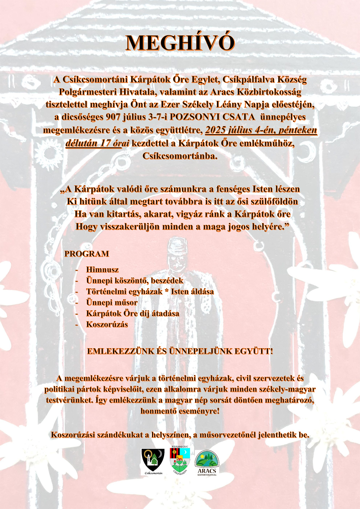 Az Ezer Székely Leány Napja előestéjén, pénteken 17 órától a Kárpátok Őre emlékműnél, Csíkcsomortánban emlékeznek meg a 907. július 4–7. között zajló pozsonyi csatáról. A megemlékezésre várják egyházak, civil szervezetek és politikai pártok képviselőit, illetve minden székely-magyar embert. Szervezők: Csíkpálfalva Község Polgármesteri Hivatala, Csíkcsomortáni Kárpátok Őre Egylet, Aracs Közbirtokosság.