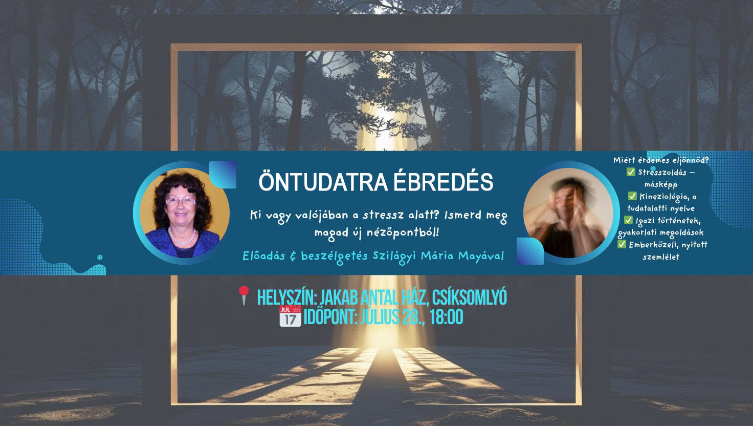 Öntudatra ébredés címmel szerveznek előadást és beszélgetést Szilágyi Mária Maya professzionális kineziológussal hétfőn 18 órától Csíksomlyón, a Jakab Antal Házban. A találkozón többek között szó lesz arról, hogyan hat a múltunk a jelen döntéseinkre, mit árul el a testünk lelkiállapotunkról, és a legnehezebb élethelyzeteinkben miért nem elég mindig a logikus gondolkodás a jó megoldás megtalálására. Az előadás során a jelenlévők megismerkedhetnek a kineziológia hatékony módszereivel, és gyakorlati útmutatást is kapnak annak alkalmazására. Az eseményre ingyenes a belépés, de előzetes jelentkezéshez kötött, ez megtehető a 0771–069933-as telefonszámon üzenetben vagy WhatsAppon.