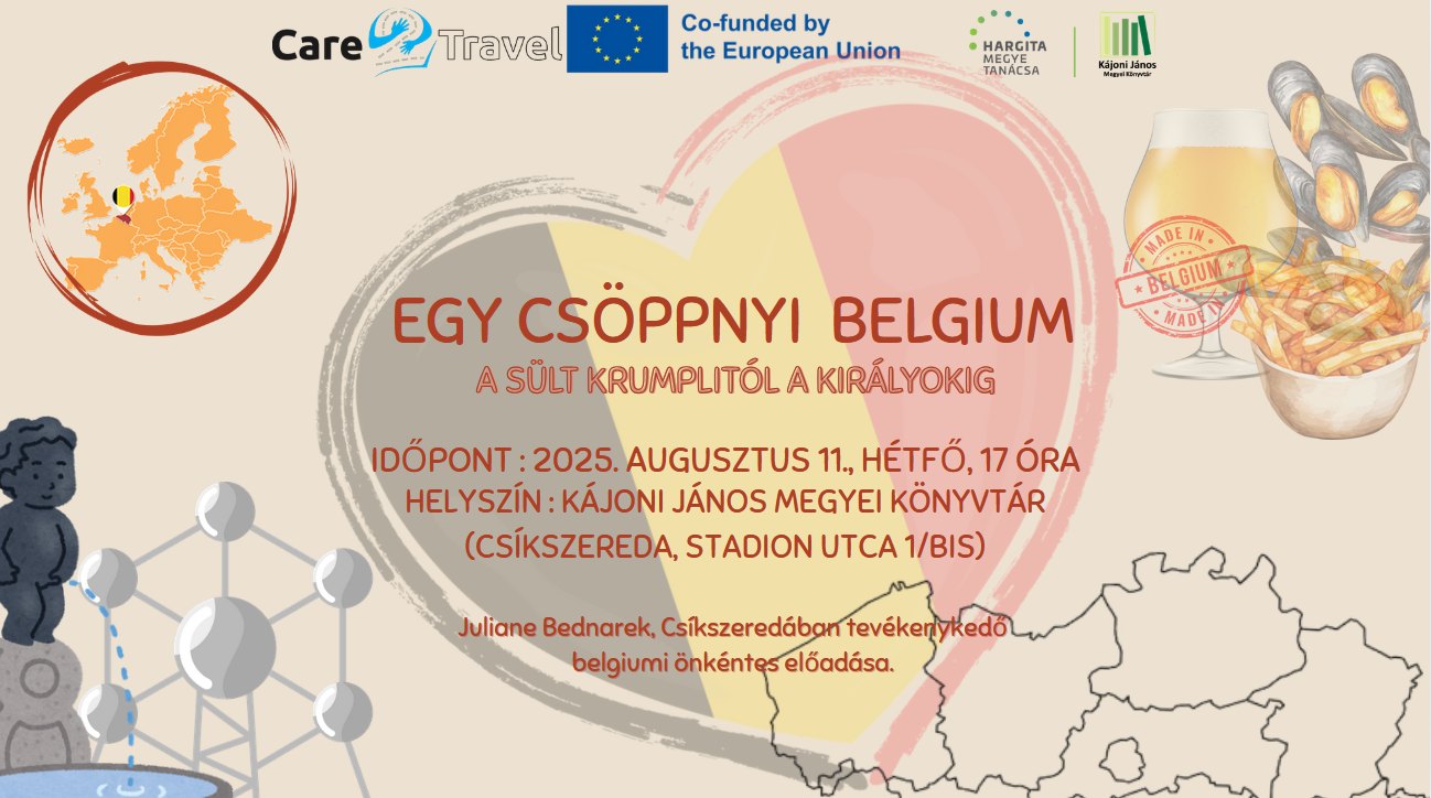 Egy csöppnyi Belgium: a sült krumplitól a királyokig címmel szervez interkulturális estet a Care2Travel Egyesület és a Kájoni János Megyei Könyvtár jövő hétfőn 17 órától a könyvtárban. Az eseményen Juliane Bednarek, a Csíkszeredában tartózkodó önkéntes mutatja be a jelenlevőknek Belgium színes történelmét, ünnepeit, gasztronómiáját és a sztereotípiákat is – személyes élményein keresztül igyekszik átadni a belga életérzést.