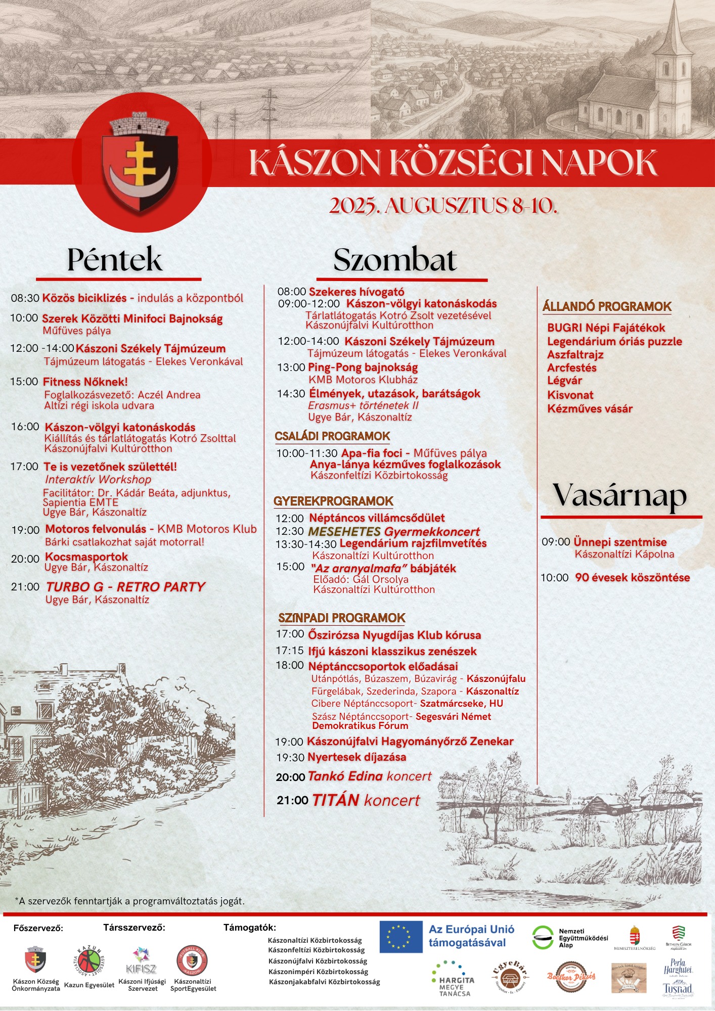 Közös biciklizés, előadások, sport- és kocsmasportbajnokságok, tájmúzeum-, kiállítás- és tárlatlátogatás, interaktív műhelymunkák, motorosfelvonulás, családi és gyermekprogramok, kézművesvásár, néptánc-villámcsődület, koncertek és bulik várnak minden érdeklődőt a péntektől vasárnapig tartó Kászon községi napokra. A színpadon szombaton 12.30-tól a Mesehetes zenekar koncertezik, 20 órától fellép Tankó Edina, 21 órától pedig TITÁN-koncert lesz.