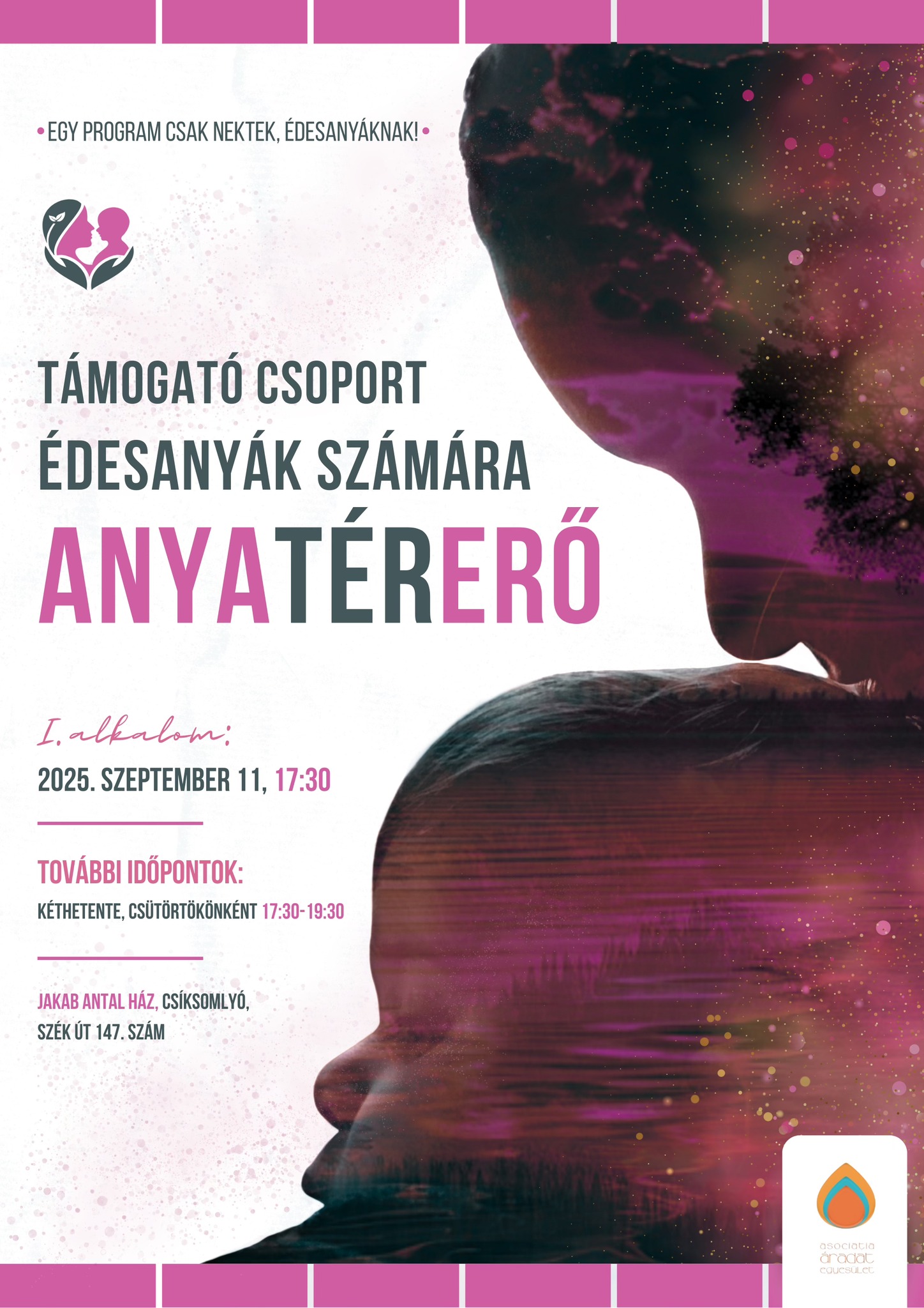 Tízalkalmas közös anyai útra hívják szeptemberrel kezdődően azokat a nőket, akiknek 0–6 éves korú gyermekük van, és vágynak arra, hogy időt töltsenek önmagukkal, más édesanyákkal, rátekintsenek az anyai létükre, a személyiségük és életük változásaira, megosszák tapasztalataikat és értő figyelemmel meghallgassák egymást. Az AnyaTérErő névre keresztelt támogatói csoport találkozóit szeptember 11-től kéthetente csütörtökönként szervezik meg a csíksomlyói Jakab Antal Házban 17.30 és 19.30 között, a csoportvezető János Renáta-Katalin pedagógus, mentálhigiénés szakember lesz. A részvétel előzetes bejelentkezéshez kötött, ez megtehető a janos.renata.katalin@gmail.com e-mail-címen vagy a csoportvezető Facebook-oldalán üzenetben. A részvételi díj 50 lej/alkalom, a jelentkezés a részvételi díj (500 lej) kifizetésével válik érvényessé, melyet szeptember 5-ig kell utalni az Áradat Egyesület bankszámlájára. További részletek elérhetők az Áradat Egyesület közösségi oldalán.