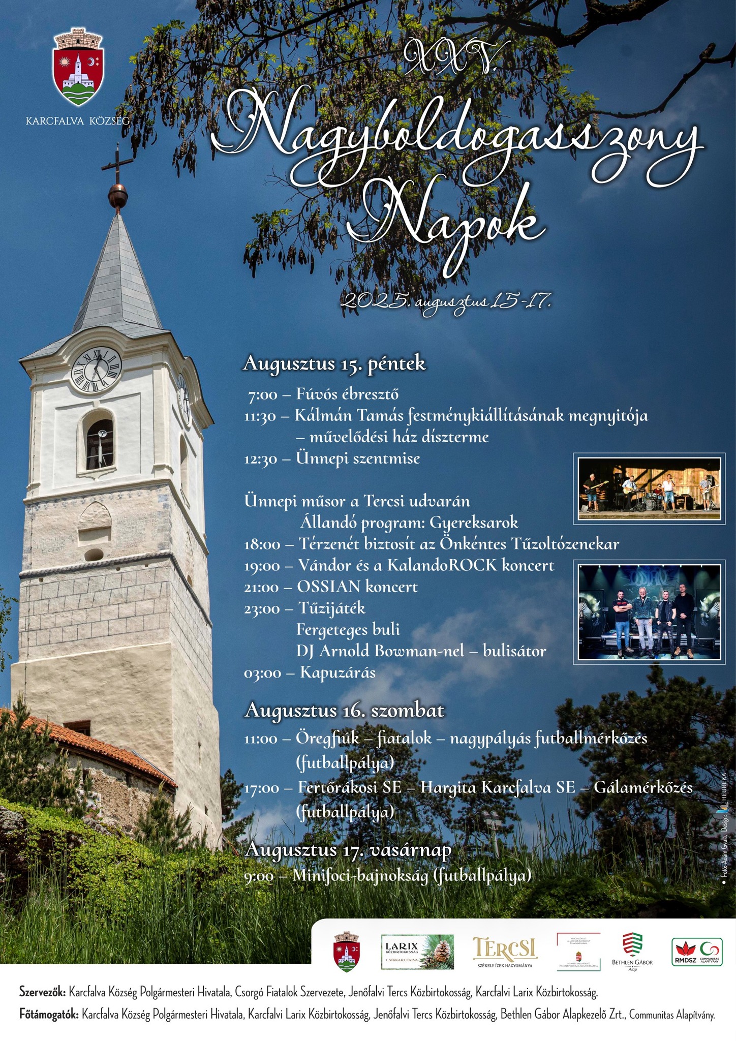 Holnaptól vasárnapig zajlik a Nagyboldogasszony Napok Karcfalván. A 25., jubileumi évfordulóhoz érkezett rendezvénysorozat idén festménykiállítással, ünnepi műsorokkal, gyermek- és sportprogramokkal, koncertekkel és bulikkal várják az érdeklődőket. Pénteken 19 órától fellép a Vándor és a KalandoROCK, 21 órától pedig az OSSIAN koncertezik.
