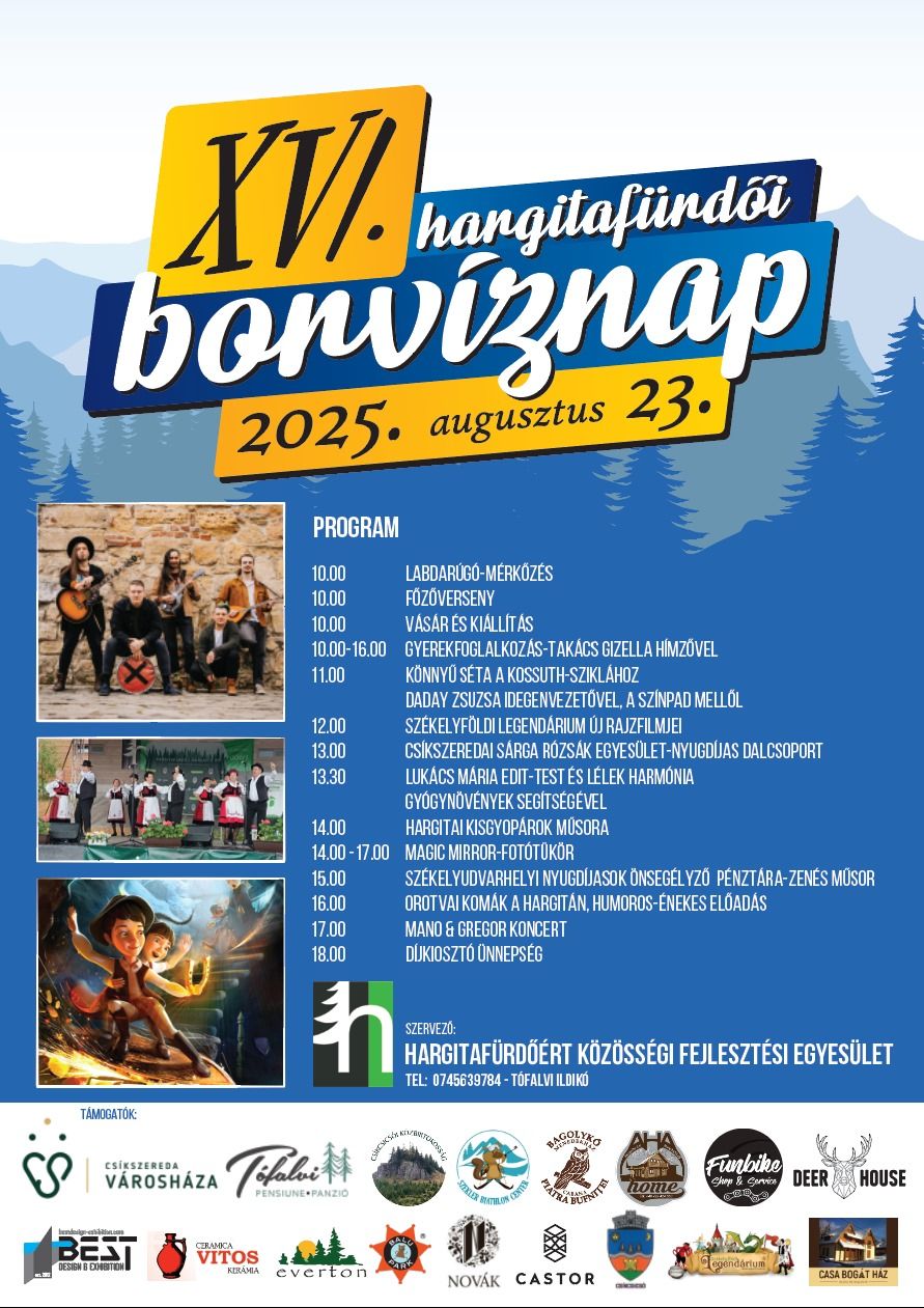 Szombaton, augusztus 23-án tartják a XVI. Hargitafürdői Borvíznapot, ahol labdarúgó mérkőzéseket, vásárt, főzőversenyt, gyerekprogramokat, rajzfilmvetítést, kulturális műsorokat, zenés műsorokat és humorelőadást szerveznek. Az esemény este a főzőverseny díjkiosztójával és Mano & Gregor koncerttel zárul.