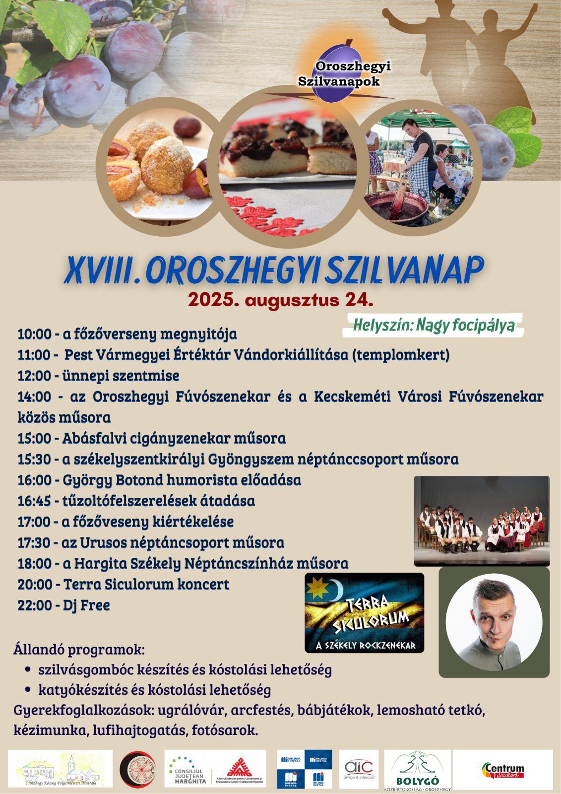 Vasárnap, augusztus 24-én szervezik meg Oroszhegyen a XVIII. Oroszhegyi Szilvanapot, a Nagy focipályán. Az eseményen főzőverseny, ünnepi szentmise, kiállítás, fúvószenekar koncert, kulturális előadások várják az érdeklődőket. 16 órától fellép György Botond humorista, majd 20 órától a Terra Siculorum koncertezik, aztán éjszakába nyúló bulit biztosít Dj Free.