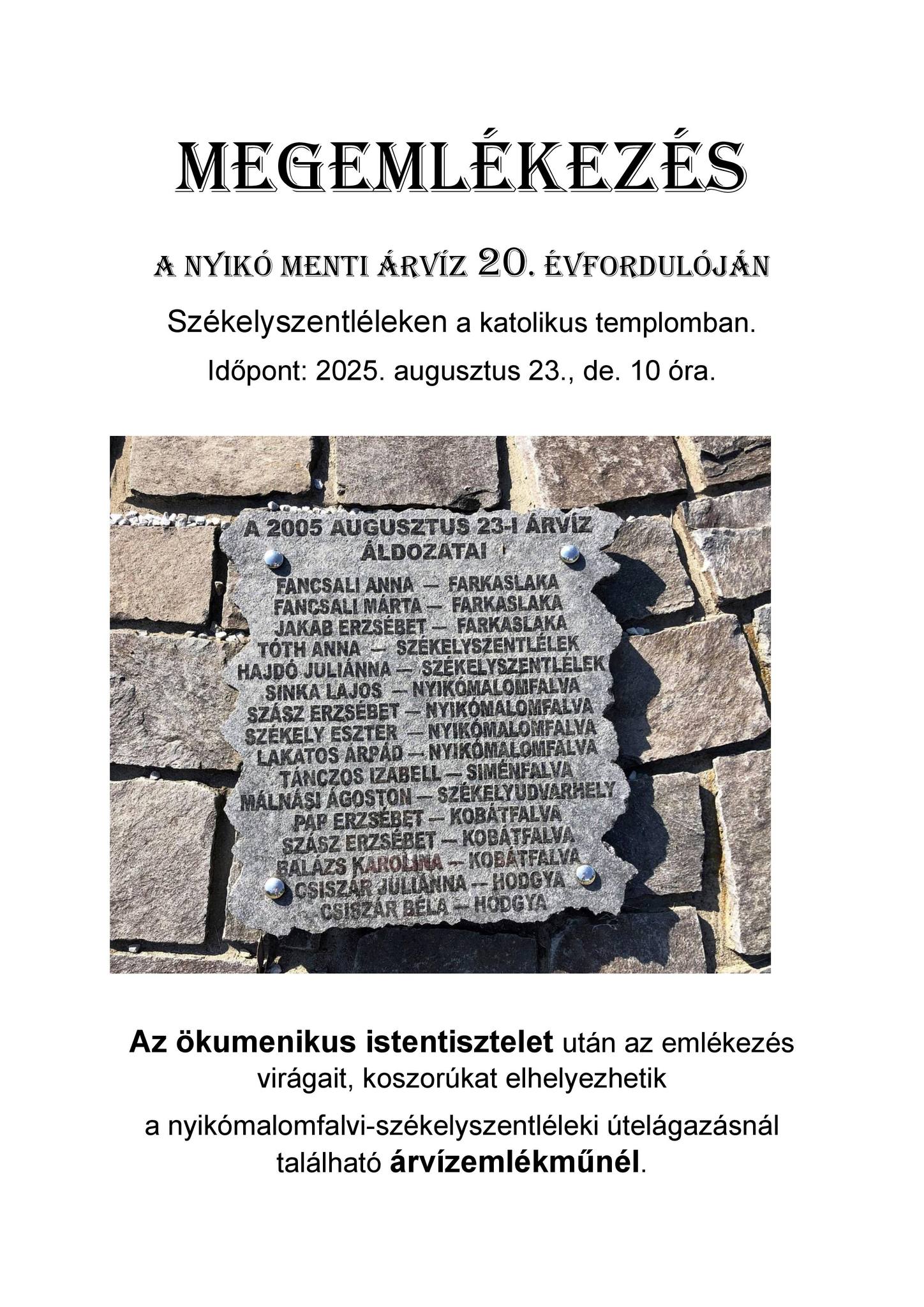 Augusztus 23-án, szombat délelőtt megemlékezést tartanak Farkaslaka községben a Nyikó menti árvíz 20. évfordulójára. 10 órától ökumenikus istentisztelettel kezdődik az esemény a székelyszentléleki katolikus templomban, majd az emlékezés virágait és koszorúit elhelyezik a nyikómalomfalvi-székelyszentléleki útelágazásnál található árvízemlékműnél