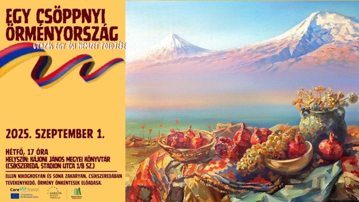 A Kájoni János Megyei Könyvtár és a Care2Travel Egyesület meghívnak mindenkit, hogy felfedezzen egy országot, ahol a történelem több ezer évre nyúlik vissza, a sárgabarack ültetvények ragyognak a napfényben, és minden vendéget családként fogadnak. Az Európai Szolidaritási Testület önkéntesei, Sona és Elen kalauzolnak el Örményország gazdag kultúráján keresztül, a finom ételektől a lélegzetelállító tájakon és az egyedi ábécén át. Az eseményt szeptember 1-én, hétfőn tartják 17 órától a Kájoni János Megyei Könyvtárban.
