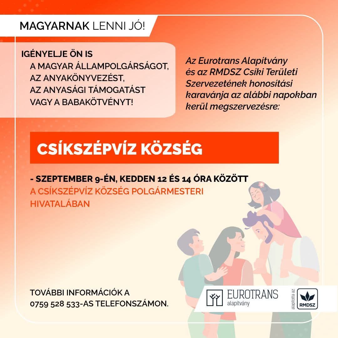 Az RMDSZ Csíki Területi Szervezete az Eurotrans Alapítvánnyal együttműködve kiszállást szervez Szépvíz községbe (polgármesteri hivatal). Az érdeklődők kedden 12 és 14 óra között adhatják le a különböző eljárásokhoz szükséges irataikat. A dossziék összeállítása minden esetben díjmentes. Érdeklődni az RMDSZ Csíki Területi Szervezetének székházában (Csíkszereda, Mihai Eminescu utca 2/A szám) vagy a Magyar Ügyek Házában, hétköznapokon 8 és 16 óra között, valamint a 0759–528533-as telefonszámon lehet.