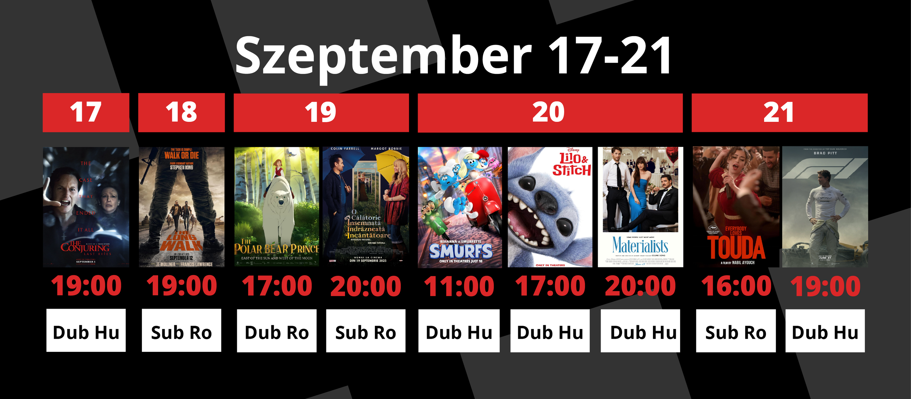Szerdán 19 órától a Démonok között – Utolsó rítusok című horrorfilmet vetítik magyar hanggal, csütörtökön 19 órától pedig a The Long Walk című horror lesz látható angol (eredeti) nyelven, román felirattal. Pénteken 17 órától a The Polar Bear Prince animációs kalandfilmet tűzik műsorra román szinkronhanggal, és 20 órától az A Big Bold Beautiful Journey című drámát vetítik angol (eredeti) nyelven, román felirattal. Szombaton 11 órától A hupikék törpikék című animációs vígjátékot vetítik magyar nyelven, 17 órától műsorra tűzik a Lilo és Stitch – A csillagkutya című kalandfilmet magyar nyelven, 20 órától pedig a Többesélyes szerelem című romantikus vígjátékot vetítik magyar szinkronhanggal. Vasárnap 16-tól az Everybody Loves Touda című drámát tűzik műsorra arab (eredeti) nyelven, román felirattal, a vetítések sorát az F1 – A film zárja magyar hanggal 19 órától.