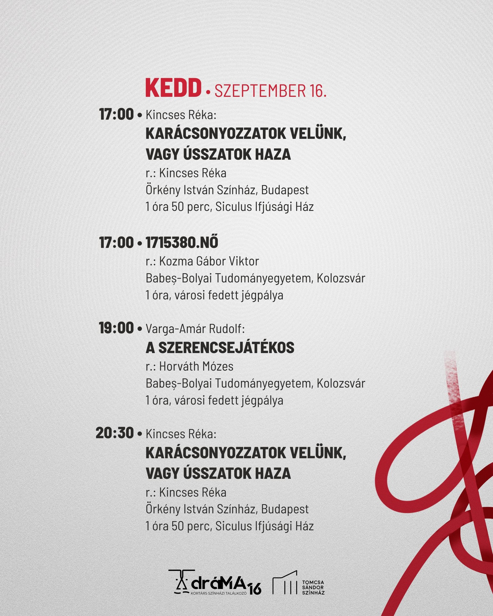 Folytatódik a 16. dráMA kortárs színházi találkozó Székelyudvarhelyen. Kedden 17 órától a Karácsonyozzatok velünk, vagy ússzatok haza (r.: Kincses Réka) című darabot viszi a Siculus Ifjúsági Ház színpadára a budapesti Örkény István Színház, és ugyancsak 17 órától a városi fedett jégpályán mutatják be a kolozsvári Babeş–Bolyai Tudományegyetem tanulói az 1715380.NŐ (r.: Kozma Gábor Viktor) előadást. 19 órától A szerencsejátékos (r.: Horváth Mózes) című darabot állítják színpadra a városi fedett jégpályán, végül 20.30-tól ismét a Karácsonyozzatok velünk, vagy ússzatok haza előadás lesz látható a Siculus Ifjúsági Házban. A fesztiválra a Siculus Ifjúsági Házban, valamint online az in-time.hu honlapon lehet jegyet váltani – jegyek korlátozott számban kaphatók.