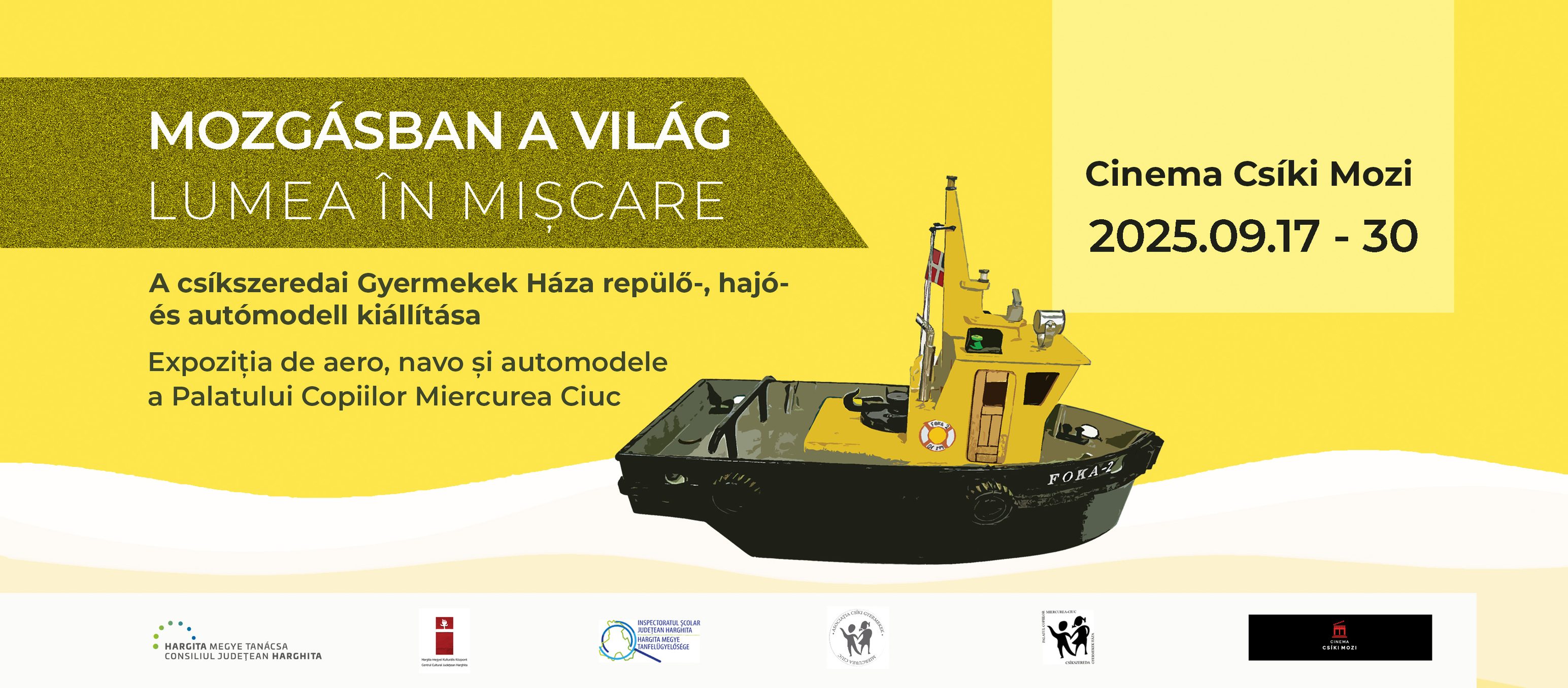 Mozgásban a világ címmel nyitják meg a csíkszeredai Gyermekek Háza repülő-, hajó- és autómodell-kiállítását szerdán 18 órakor a Csíki Moziban. A tárlaton gyermeki kéz alkotta csodákat láthatunk, amelyek által felfedezhetjük, hogyan formálják a jövőt a legfiatalabb alkotók – kreativitással, műszaki tudással és lelkesedéssel. A szeptember 30-ig látogatható kiállításra a belépés ingyenes. Szervezők: Gyermekek Háza Csíkszereda, Hargita Megyei Kulturális Központ, Megyeháza Galéria, Hargita Megye Tanácsa.