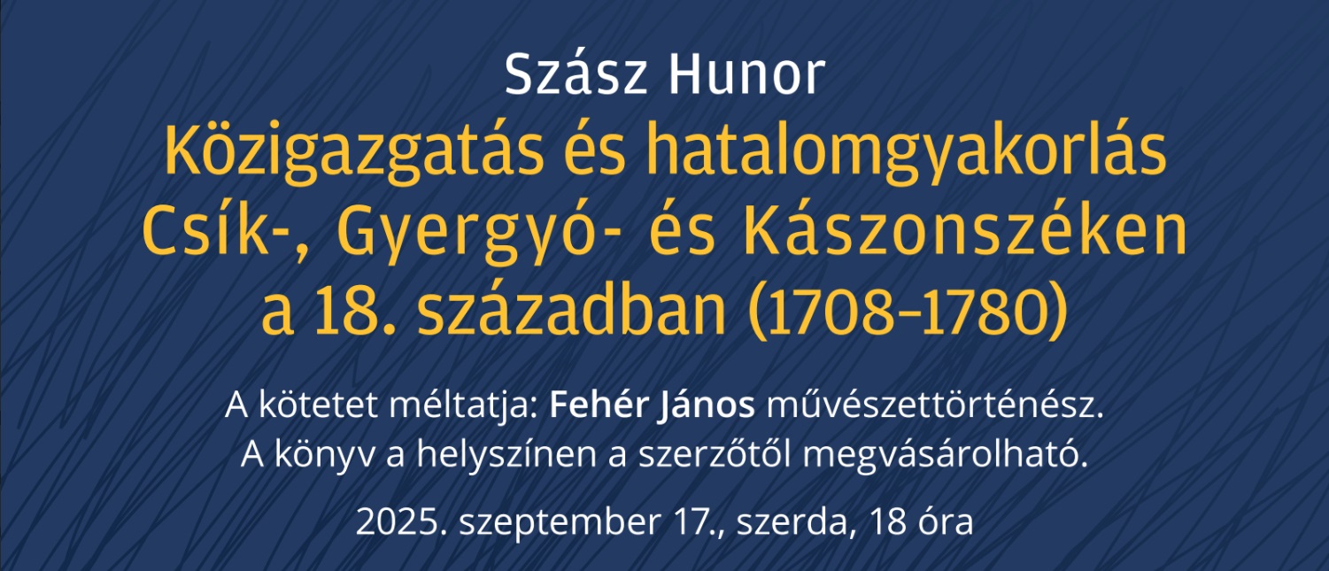 Szász Hunor a székelyudvarhelyi Haáz Rezső Múzeum történész-muzeológusának Közigazgatás és hatalomgyakorlás Csík-, Gyergyó- és Kászonszéken a 18. században (1708-1780) című kötetét mutatják be szerdán 18 órától Csíkszeredában, a Mikó-várban. A munka több szempontból alaptanulmánynak számít, Csík-, Gyergyó- és Kászonszék 18. századi közigazgatás-története szisztematikusan, intézményről intézményre, tisztségről tisztségre haladva, a társadalmi és hatalomgyakorlási összefüggések feltárásával, összefüggő eseménytörténettel szintetizálva még nem jelent meg. A kutatás olyan új eredményekkel és adatokkal szolgál, amelyek a 18. századi erdélyi közigazgatás-történetet érdemben gazdagítják, és a hiányos széki intézménytörténet számos fehér foltját eloszlatják. A kötetet Fehér János művészettörténész méltatja. A belépés ingyenes.