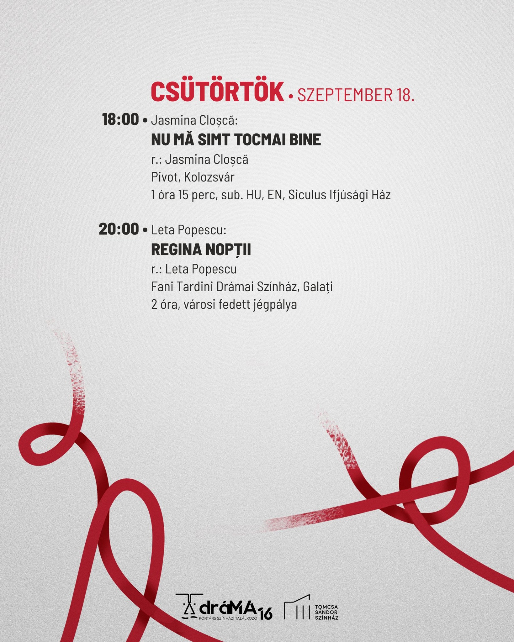 Folytatódik a 16. dráMA kortárs színházi találkozó Székelyudvarhelyen. Csütörtökön 18 órától a kolozsvári Pivot társulat vendégelőadása, a Nu mă simt tocmai bine (Nem érzem a legjobban magam) (r.: Jasmina Cloșcă) lesz látható a Siculus Ifjúsági Házban, 20 órától pedig a Regina nopţii (Éjszaka királynője) (r.: Leta Popescu) című darabot állítja a városi fedett jégpálya színpadára a galaci Fani Tardini Drámai Színház társulata. A fesztiválra a Siculus Ifjúsági Házban, va