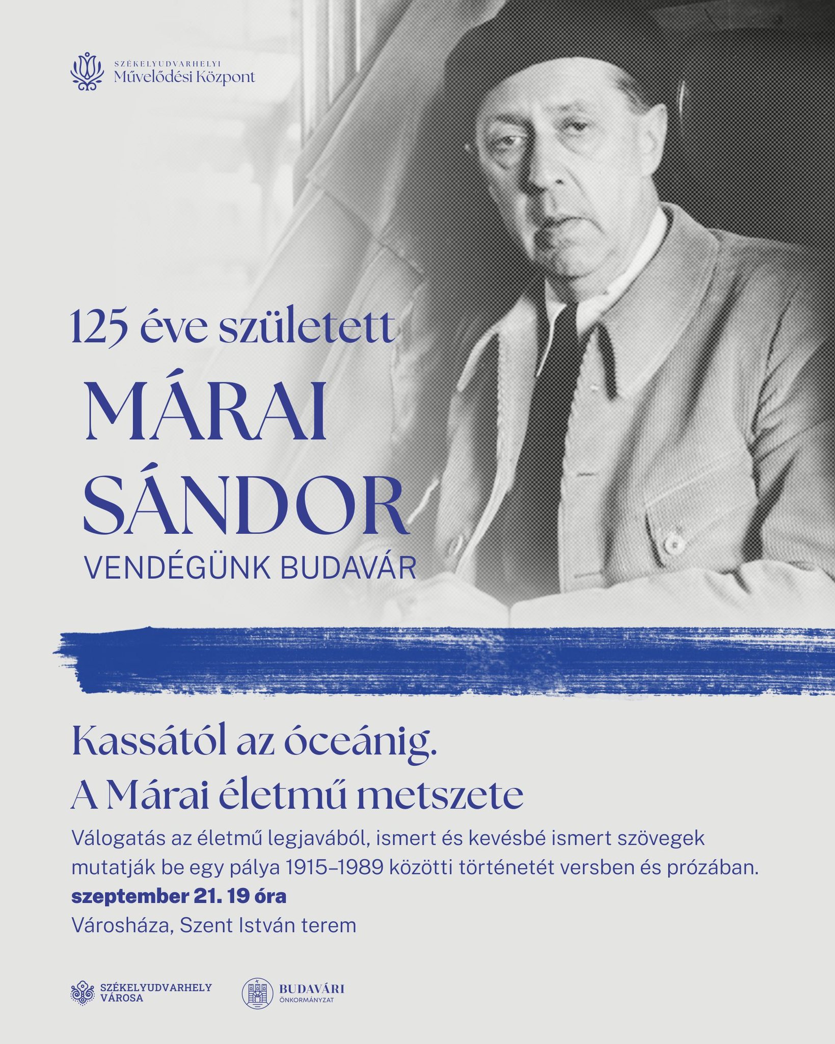 125 éve született Márai Sándor – Vendégünk Budavár címmel szerveznek visszaemlékező estet vasárnap 19 órától a székelyudvarhelyi városháza Szent István termében. Az est központi programja a Kassától az óceánig. A Márai-életmű metszete, vagyis ismert és kevésbé ismert szövegek mutatják be egy pálya 1915–1989 közötti történetét versben és prózában. Előadók: Hirtling István Jászai Mari-díjas színművész, érdemes és kiváló művész, a Halhatatlanok Társulatának örökös tagja, valamint Mészáros Tibor irodalomtörténész, a Márai Sándor-hagyaték gondozója, közreműködik: Solymosi Vince cimbalomművész.