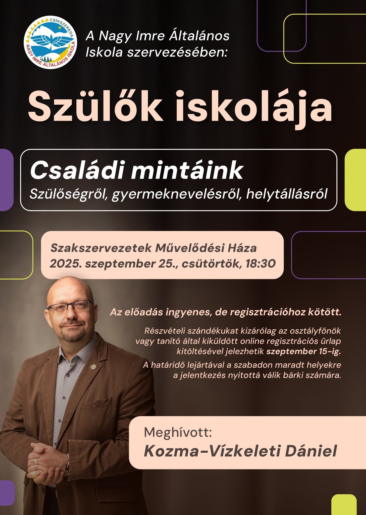 A Nagy Imre Általános Iskola által szervezett Szülők Iskolája előadás-sorozat következő alkalmán, csütörtökön Kozma-Vízkeleti Dániel Családi mintáink – Szülőségről, gyermeknevelésről, helytállásról címmel tart előadást Csíkszeredában, a Szakszervezetek Művelődési Házában 18.30-tól. A rendezvény ingyenes, ugyanakkor a részvételhez előzetes regisztráció szükséges.