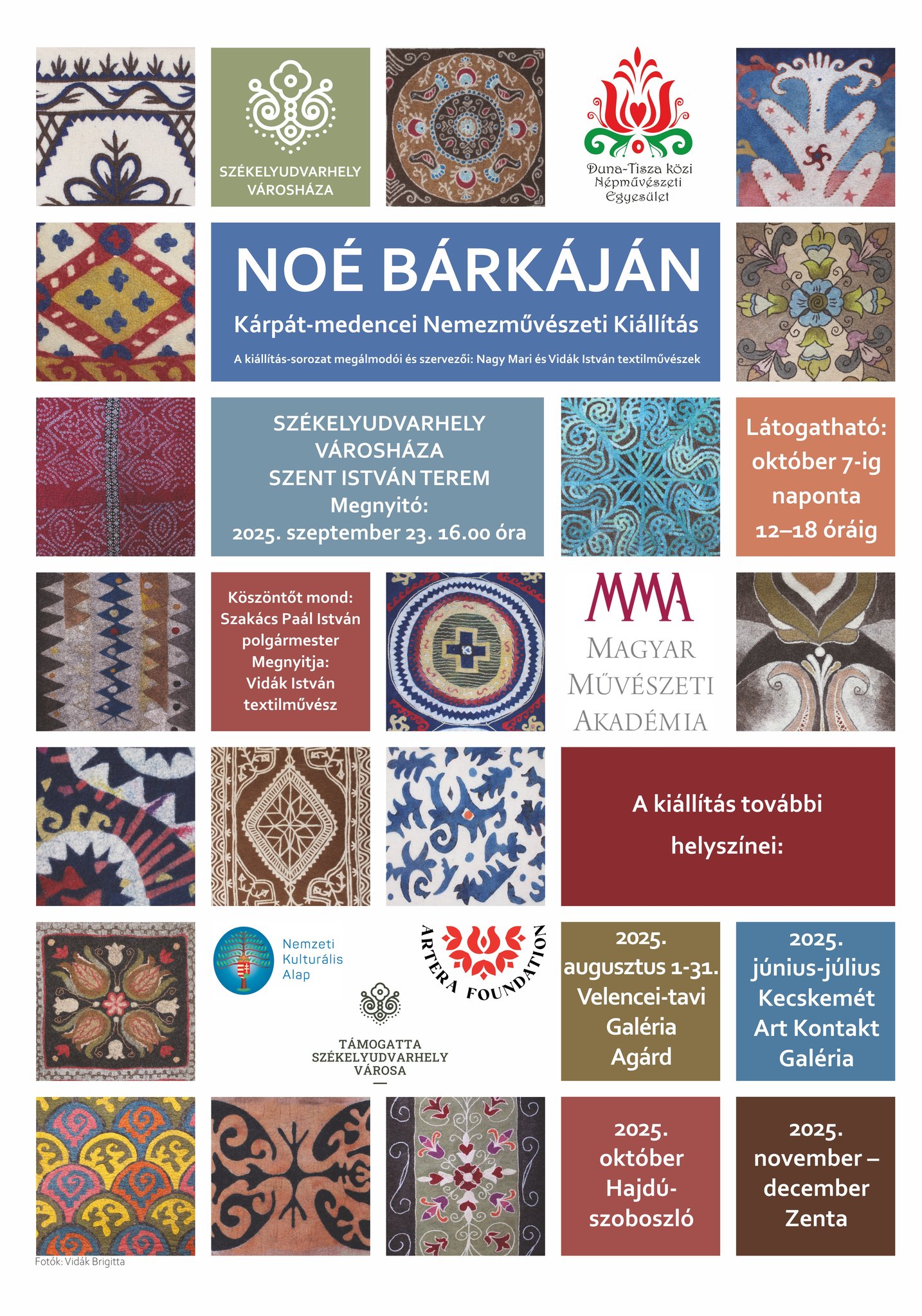 A Kárpát-medencei Nemezművészeti Kiállítás nyílik meg Noé bárkáján címmel Székelyudvarhelyen, a városháza Szent István termében, kedden 16 órától. A pályázat gazdája a Duna–Tisza Közi Népművészeti Egyesület Nemezművészeti Alkotócsoportja, Nagy Mari és Vidák István, akik januárban kezdték el felkérni az ismert nemezkészítőket. Összesen 74 jelentkező munkái kerültek be az első kiállításba. A 74 alkotóból 10 erdélyi, 1 vajdasági, 1 felvidéki alkotó jelentkezett. Kárpátalját egy közösen készített nemeztakaróval 28 fős gyermekcsoport képviseli.
