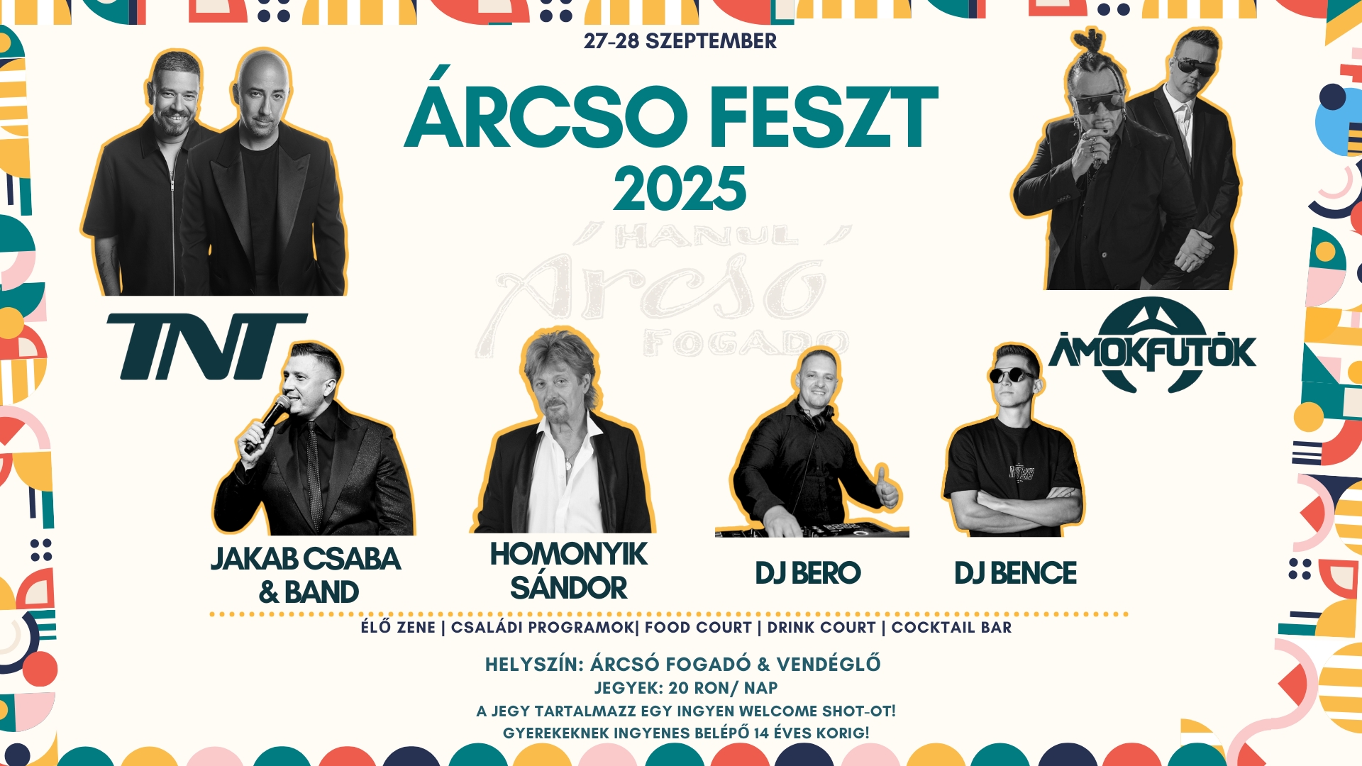 Első alkalommal szervezik meg az Árcsó Fesztivált a Korondi Árcsó Fogadó rendezésében, a szervezők szeretnék újraéleszteni az egykori Árcsói Fazekasvásár hangulatát. Az eseményen szeptember 27–28-án lesznek gyerekprogramok, food court sátrak, kulturális programok és koncertek, szombaton fellép Homonyik Sándor és az Ámokfutók, vasárnap Jakab Csaba & Band, valamint a TNT koncertje hallgatható. A napijegy ára 20 lej, amit a helyszínen lehet megvásárolni. Gyerekeknek 14 éves korig ingyenes a belépés.