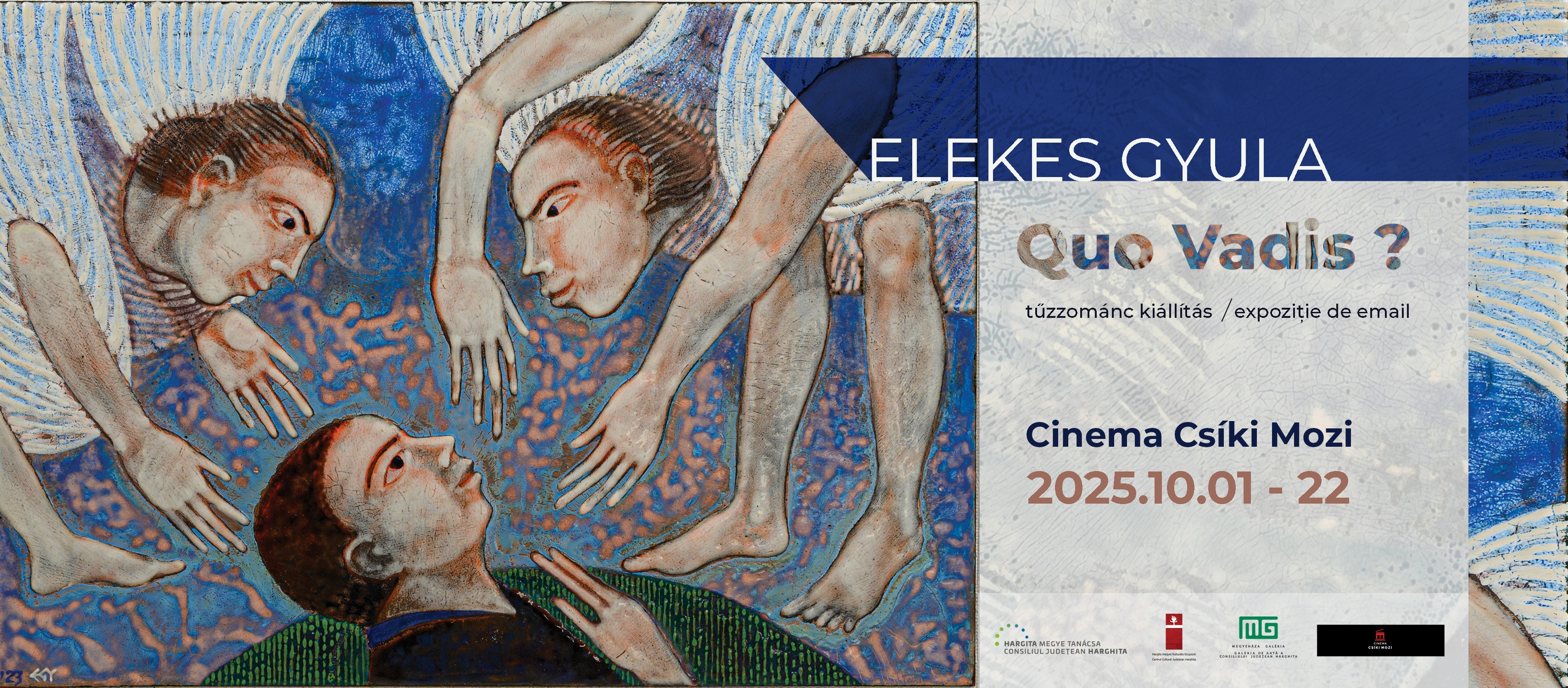 Quo vadis? címmel nyitják meg Elekes Gyula tűzzománcművész kiállítását szerdán 18 órától a Csíki Moziban. A tárlat a művész gazdag és sokrétű világát tárja a közönség elé, a művek színekben gazdag, szimbólumokkal átszőtt, történetmesélő világa életre kel a néző előtt. A kiállítás címe – Quo vadis?, vagyis Hová tartunk? – önmagában is kérdésfelvetés: Hol vagyunk most? Merre tartunk? Mit viszünk magunkkal, és mit hagyunk hátra? A kiállítást Tőke Sugárka művészettörténész nyitja meg, a belépés ingyenes. A tárlat október 22-ig tekinthető meg. Szervezők: Hargita Megyei Kulturális Központ, Megyeháza Galéria, Hargita Megye Tanácsa.