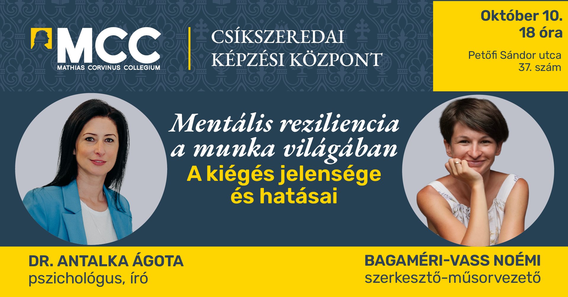 Mentális reziliencia a munka világában – A kiégés jelensége és hatásai címmel tart előadást dr. Antalka Ágota pszichológus, író pénteken 18 órától az MCC Csíkszeredai Képzési Központjában (Petőfi Sándor utca 37. szám). Az előadás tudományos igényességgel tárgyalja a burnout szindróma kialakulásának pszichológiai és szervezeti tényezőit, valamint annak egyéni és kollektív következményeit. Az esemény célja, hogy a résztvevők elméleti tudással gazdagodjanak, és átfogó képet kapjanak erről a társadalmi szinten megmutatkozó jelenségről. A meghívott előadó beszélgetőtársa Bagaméri-Vass Noémi, az Erdélyi Magyar Televízió és a Hargita Stúdió szerkesztő-műsorvezetője lesz. A részvétel regisztrációhoz kötött, ez megtehető az esemény közösségi oldalán levő űrlap kitöltésével.
