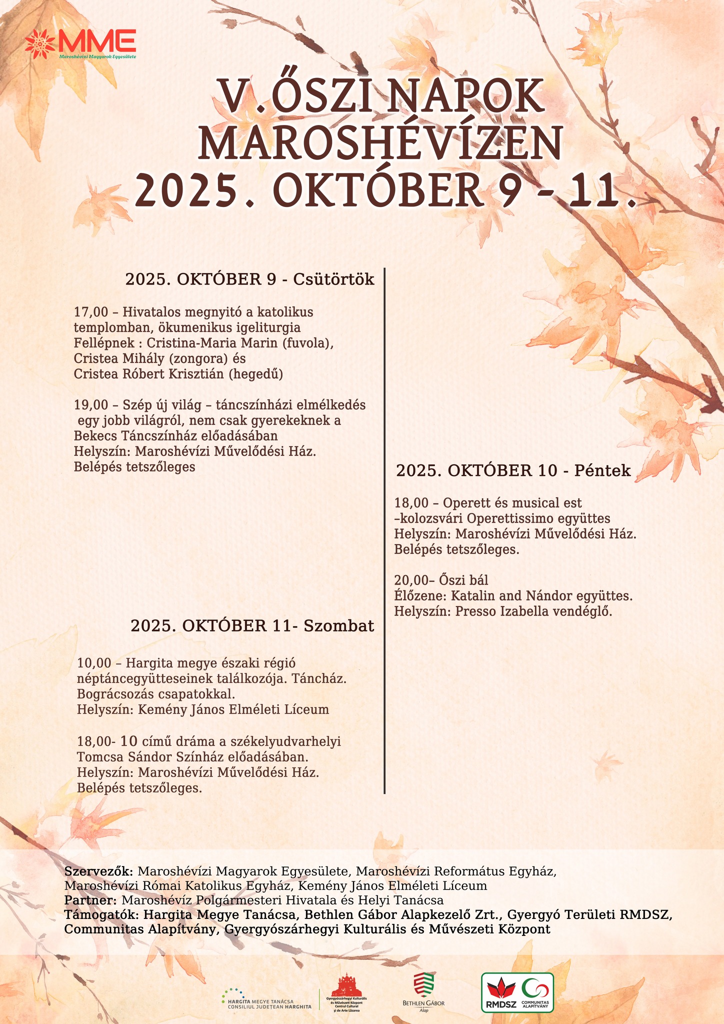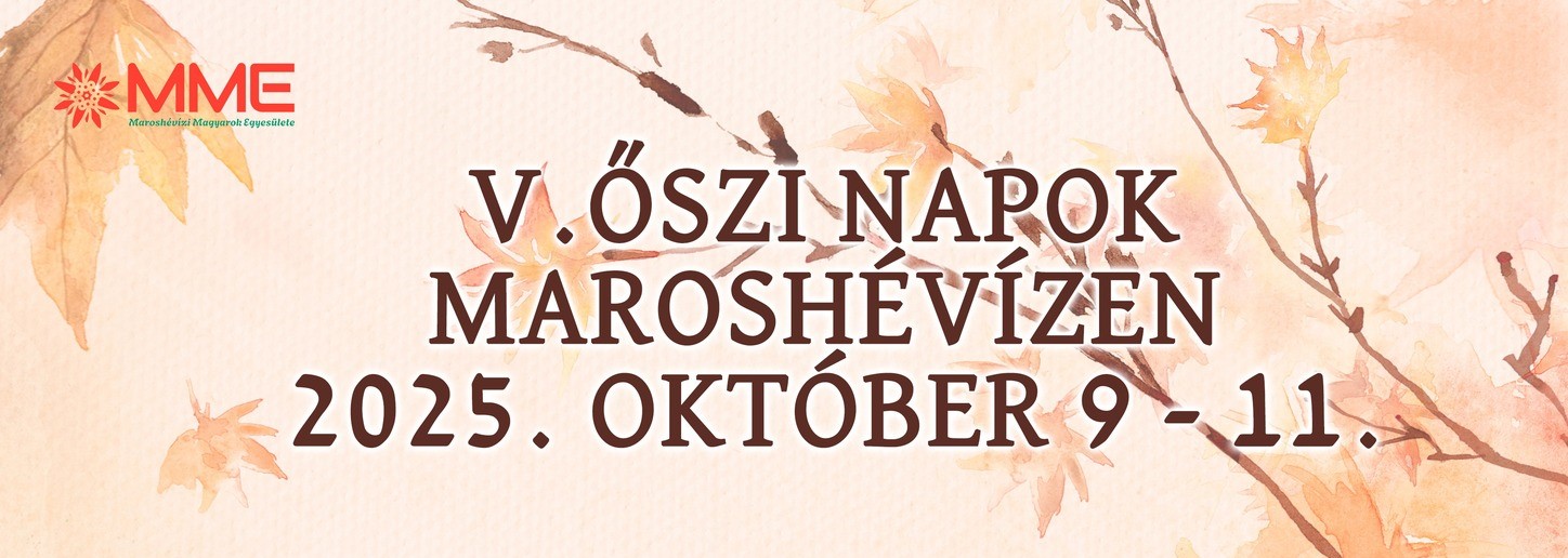 Csütörtöktől szombatig szervezik meg az V. Őszi Napok című rendezvényt Maroshévízen. Az esemény hivatalos megnyitóját csütörtökön 17 órakor tartják a helyi katolikus templomban, majd a hétvége során táncszínházi előadás, operett- és musicalest, őszi bál, Hargita megye északi régiója néptáncegyütteseinek találkozója, táncház, bográcsozás, valamint a székelyudvarhelyi Tomcsa Sándor Színház 10 című előadása várja az érdeklődőket különböző helyszíneken. Szervezők: Maroshévízi Magyarok Egyesülete, Maroshévízi Református Egyház, Maroshévízi Római Katolikus Egyház, Kemény János Elméleti Líceum; partnerek: Maroshévíz Polgármesteri Hivatala és Helyi Tanácsa; támogatók: Hargita Megye Tanácsa, Bethlen Gábor Alapkezelő Zrt., Gyergyó Területi RMDSZ, Communitas Alapítvány.
