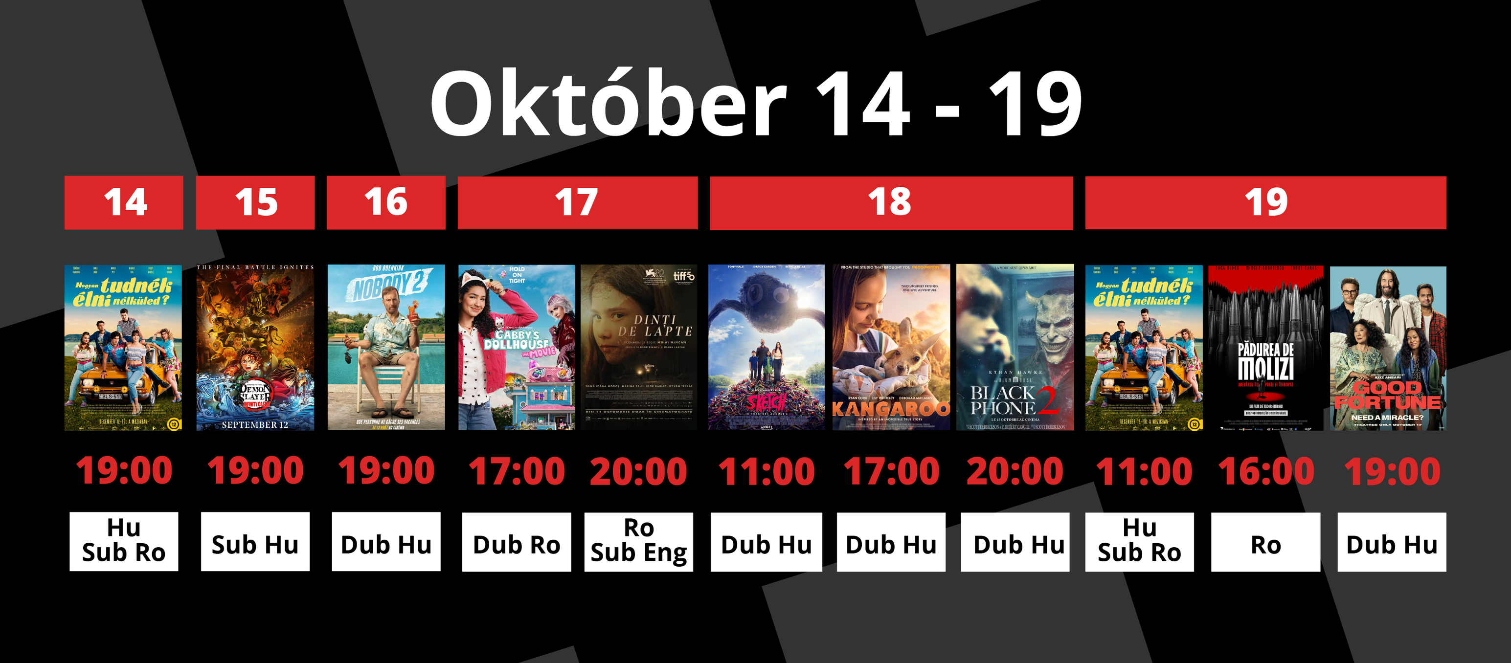 Kedden 19 órától vetítik a Hogyan tudnék élni nélküled? című zenés vígjátékot magyar (eredeti) nyelven, román felirattal. Szerdán 19 órától a Demon Slayer: Kimetsu no Yaiba Infinity Castle című animációs film lesz látható japán (eredeti) nyelven, magyar felirattal, majd csütörtökön 19 órától a Senki 2-t tűzik műsorra magyar szinkronnal. Pénteken 17 órától megtekinthető a Gabby's Dollhouse: The Movie román szinkronnal, 20 órától pedig a Dinți de lapte című román filmet vetítik eredeti nyelven, angol felirattal. Szombaton 11-től a Firkák című vígjátékot nézhetjük meg magyar szinkronnal, 17-től a Lili és a kenguru című vígjáték lesz látható magyar szinkronnal, majd 20-tól a Fekete telefon 2 című horrorfilmet vetítik magyar hanggal. Vasárnap 11 órától ismét vetítik a Hogyan tudnék élni nélküled?-et magyar (eredeti) nyelven, román felirattal, 16 órától a Pădurea de molizi című román történelmi dokumentumfilm lesz látható eredeti nyelven, a vetítések sorát pedig a Jó szerencse című akcióvígjáték zárja magyar nyelven 19 órától. A vetítésekre jegyek válthatók a bilete.ro honlapon.