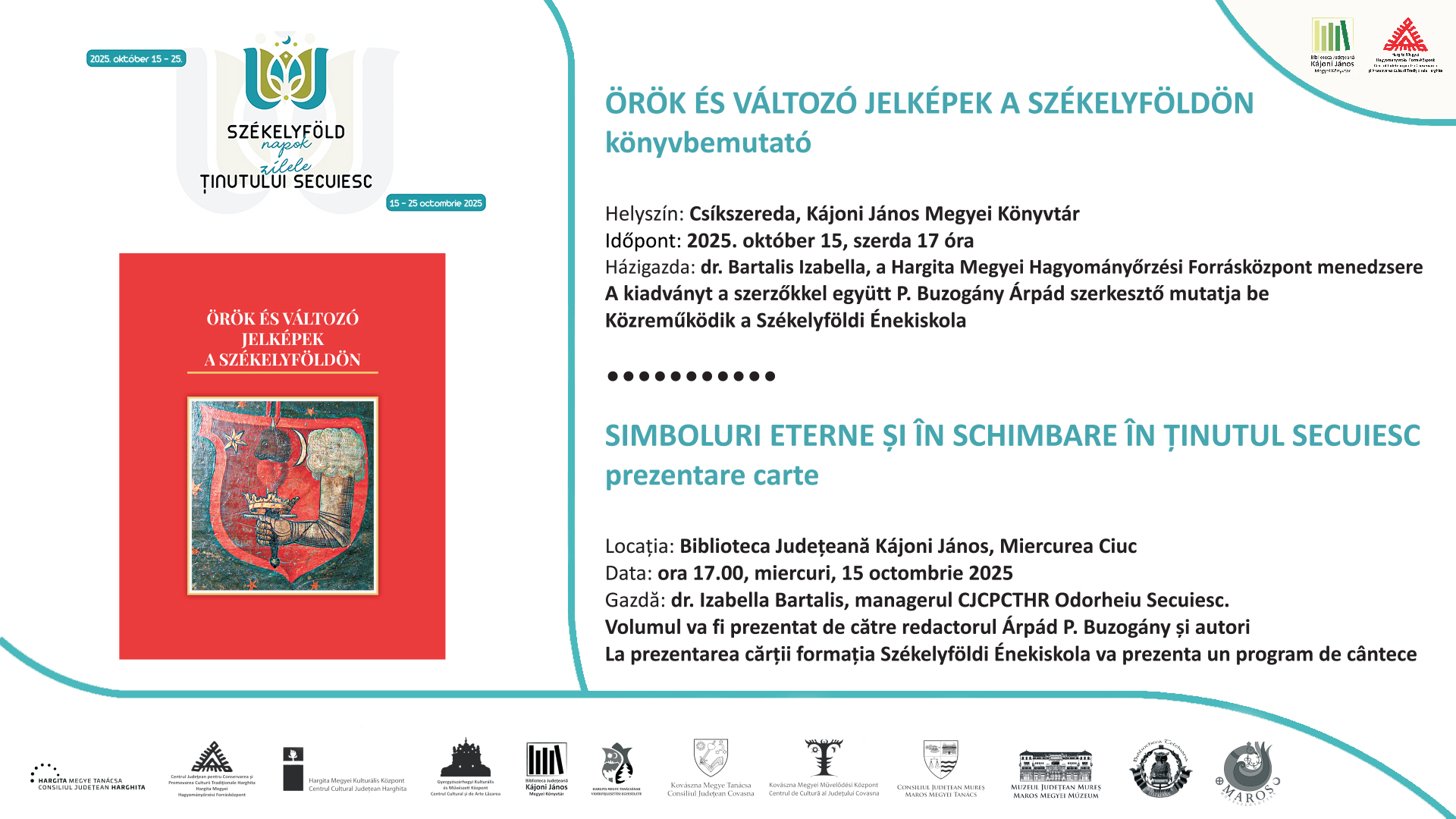 Az Örök és változó jelképek a Székelyföldön című tanulmánykötetet mutatják be szerdán 17 órától a csíkszeredai Kájoni János Megyei Könyvtár Cseke Gábor termében. A kiadvány dr. Bicsok Zoltán csíkszeredai levéltáros, Mihály János lövétei történész, helytörténész, dr. Pál-Antal Sándor marosvásárhelyi nyugalmazott levéltáros és a sepsiszentgyörgyi dr. Szekeres Attila István nemzetközi címerakadémikus tanulmányait tartalmazza székelyföldi címerekről, zászlókról és pecsétekről. Az est házigazdája dr. Bartalis Izabella, a Forrásközpont menedzsere lesz, a szerzőkkel P. Buzogány Árpád szerkesztő beszélget. Szervező: Hargita Megyei Hagyományőrzési Forrásközpont, az esemény a Székelyföld Napok részeként valósul meg.