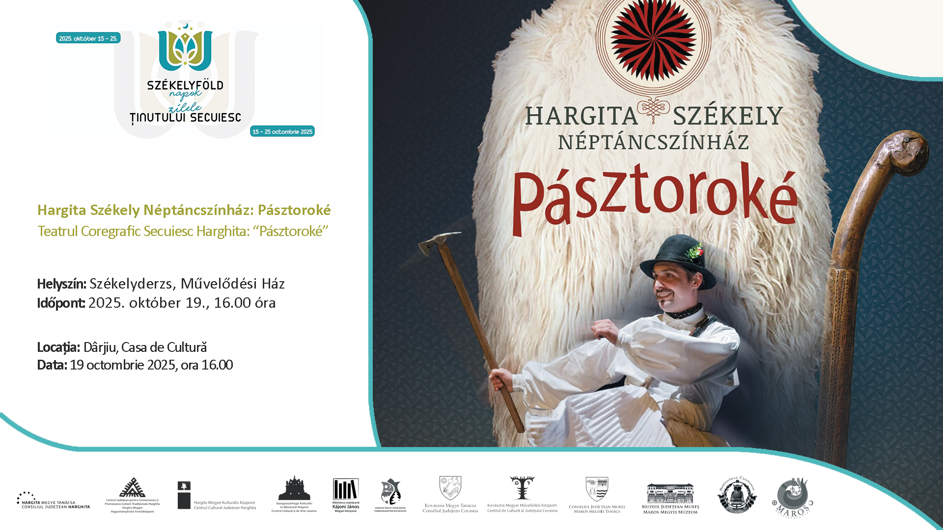 A székelyderzsi művelődési házban mutatja be Pásztoroké című műsorát a Hargita Székely Néptáncszínház vasárnap 16 órától. Az előadás egy kis ízelítő a pásztor- és a betyárélet szegletéből. Az előadásra – amely a XVI. Székelyföld Napok része – a belépés ingyenes. Szervezők: Hargita Megyei Kulturális Központ, Hargita Megye Tanácsa, Hargita Székely Néptáncszínház.