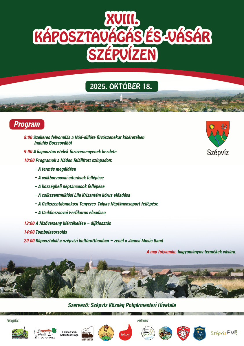 Szombaton szervezik meg a XVIII. Káposztavágás és -vásár eseményt Szépvízen. A program 8 órától kezdődik szekeres felvonulással a Nád-dűlőre (a település Gyimes felőli kijárata), majd káposztás ételek főzőversenye, termésáldás, hagyományos termékek vására, tánc- és énekcsoportok fellépései, tombolahúzás és káposztabál is lesz a szépvízi kultúrotthonban. Szervező: Szépvíz Község Polgármesteri Hivatala.