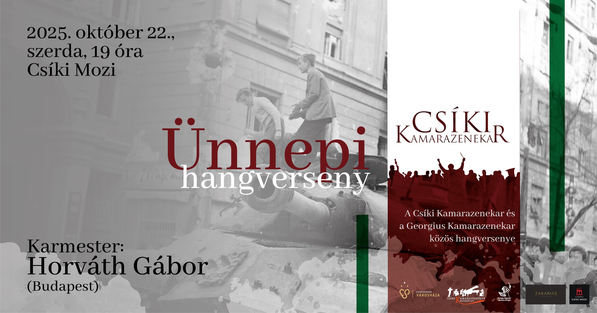 Az 1956-os forradalomra és a hősökre emlékezik a Csíki Kamarazenekar és a sepsiszentgyörgyi Georgius Kamarazenekar, közös hangversenyük szerdán 19 órától lesz a Csíki Moziban. Műsorukon Ludwig van Beethoven két emblematikus, nagyzenekari alkotása szerepel, az est karmestere a budapesti Horváth Gábor. A teljes árú jegy 30, a kedvezményes 20 lejbe kerül, melyeket a Csíki Mozi jegypénztárában lehet megvásárolni. Az előadást Csíkszereda Polgármesteri Hivatala, a Csíki Mozi, a Zakarias Apartments, a Georgius Egyesület és a Csíki Kamarazenekar Egyesület támogatja.