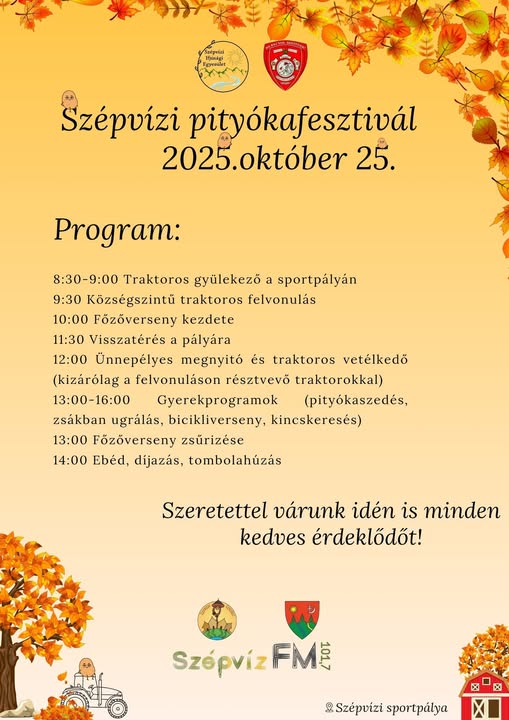 Traktoros felvonulással és vetélkedővel, főzőversennyel, gyermekprogramokkal és tombolával várnak minden érdeklődőt a Szépvízi Pityókafesztiválra, amelyet szombaton 8.30-tól szerveznek meg a szépvízi sportpályán. Szervezők: Szépvízi Ifjúsági Egyesület, Szépvízi Önkéntes Tűzoltók.